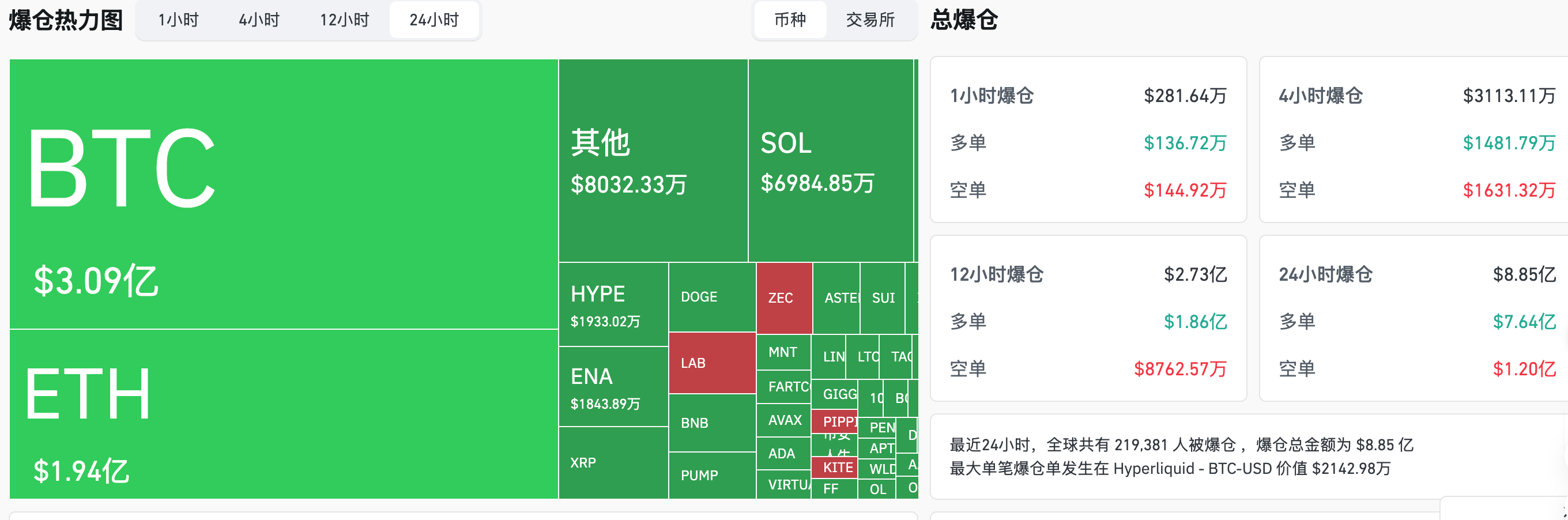 - 24小时爆仓数据:全球共219381人被爆仓 ,爆仓总金额为8.85亿美元,其BTC爆仓3.09亿美元、ETH爆仓1.94亿美元、HYPE爆仓19336万美元