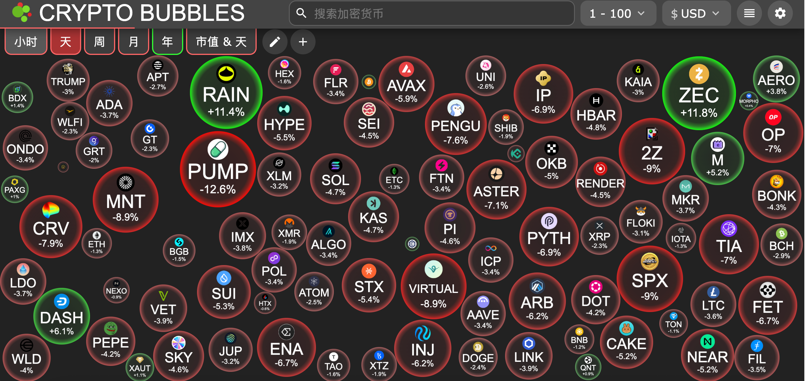 今日市值前100币种最大涨幅:Zcash涨11.8%、Rain涨11.4%、Dash涨6.1%、MemeCore涨5.2%、Aerodrome Finance涨3.8%。