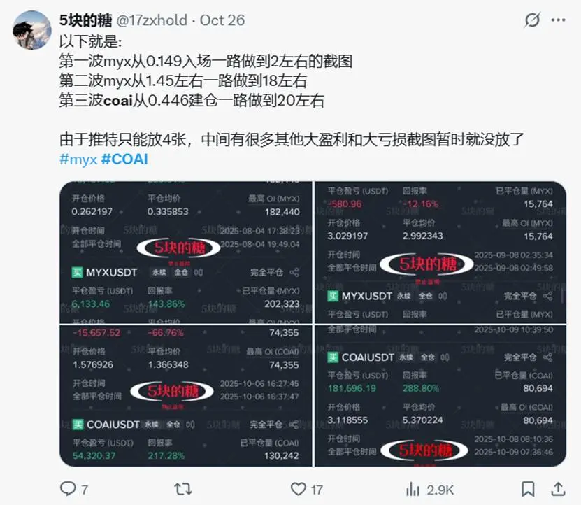 此外,KOL sanyi.eth 则反思,做空 MYX 亏损后已经主动避开妖币,COAI 0.3美元涨至61美元再回撤至18美元,该项目虽此前获得约1700万美元融资并获 Binance Labs支持,定位于 AI 赛道,项目基础不算薄弱。然而币价与估值相比,市场情绪明显过热,散户参与此类波动剧烈的币种,结局多为爆仓或支付高额资费。