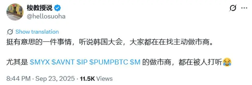 值得一提的是,据X用户 @hellosuoha反映,上个月在韩国首尔举办的KBW 2025大会上,MYXAVNTIP 等项目的成交深度引发关注,它们背后的做市商已然成为潜在拟发币项目方的重点联系对象。
