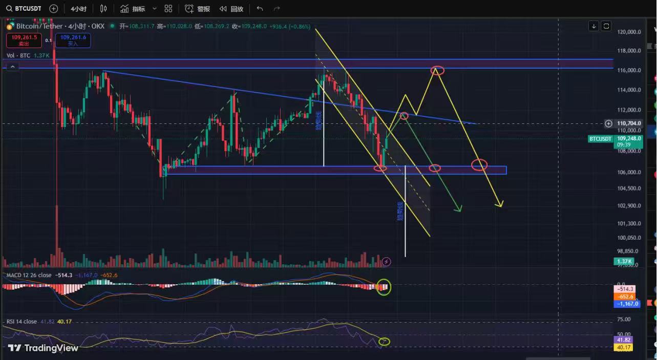 如果压力位都受阻,可能会逐步跌破下方支撑前面低点支撑带106600附近(这里跌破就形成M顶了),可能去向针尖102000-104000再次寻找支撑;