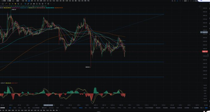ETH周线处于下跌通道,若不能突破上轨,配合MACD等指标看,仍偏空;日线处于震荡下行,昨日已跌破三角下沿但收回,反弹重点关注 3980(中轨压力) / 4050(W底颈线) / 4270(通道上轨);日若再次失守三角下沿,目标指向 3580(通道下轨) 和3380(前低)