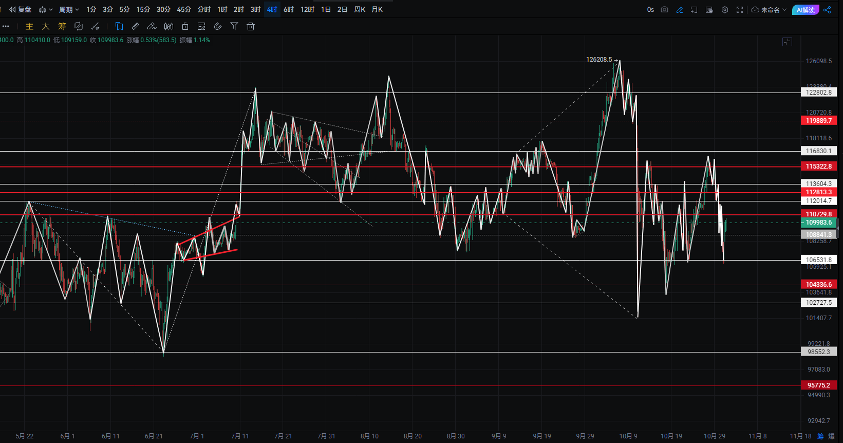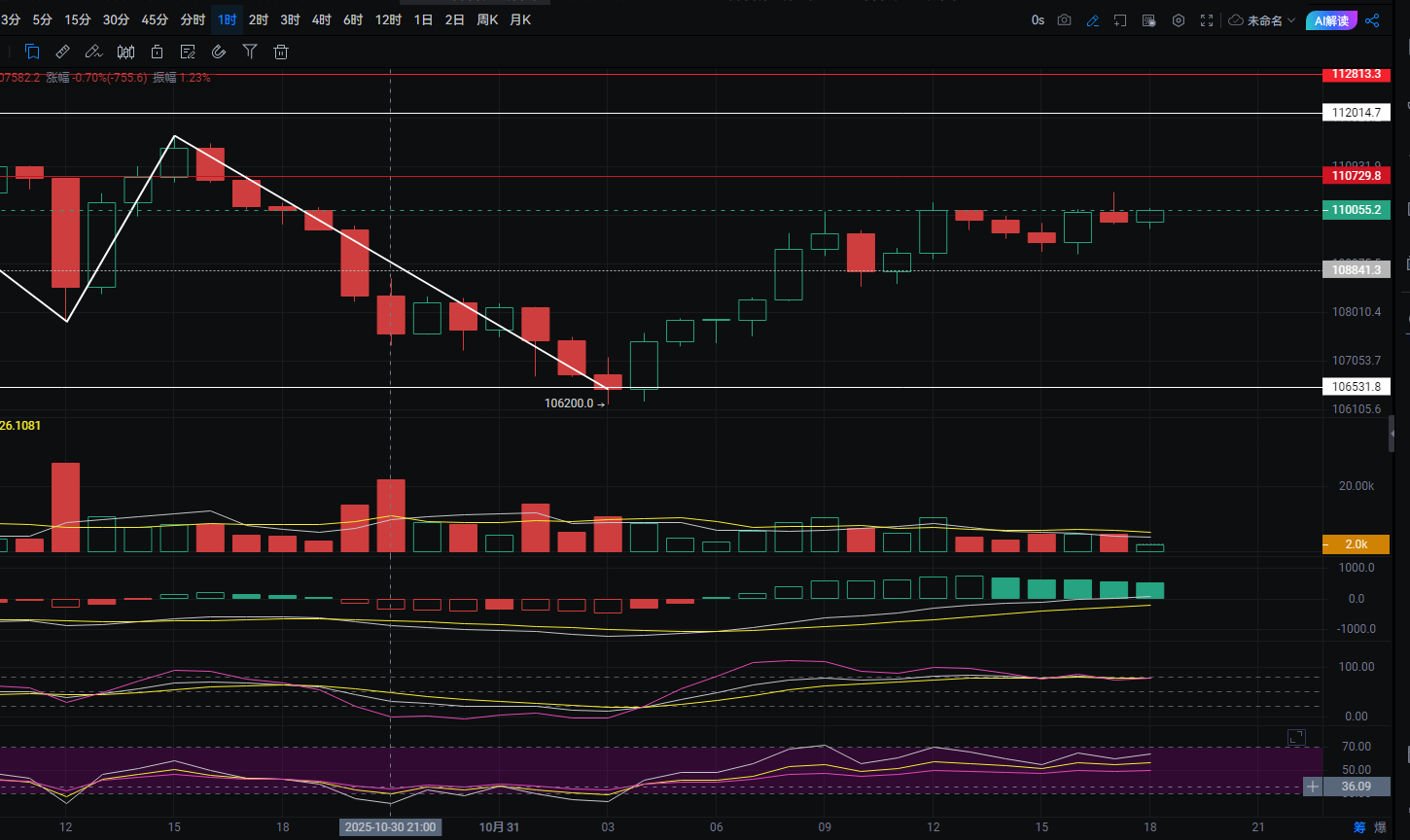 那么周末我们主要以107500-111500大区间处理,当前最接近的走势是,等空头发力,走一段连阴,再刷低位。我们重点关注的位置不变,大饼依旧是上方111500,112500,下方则108800,107500,107200,