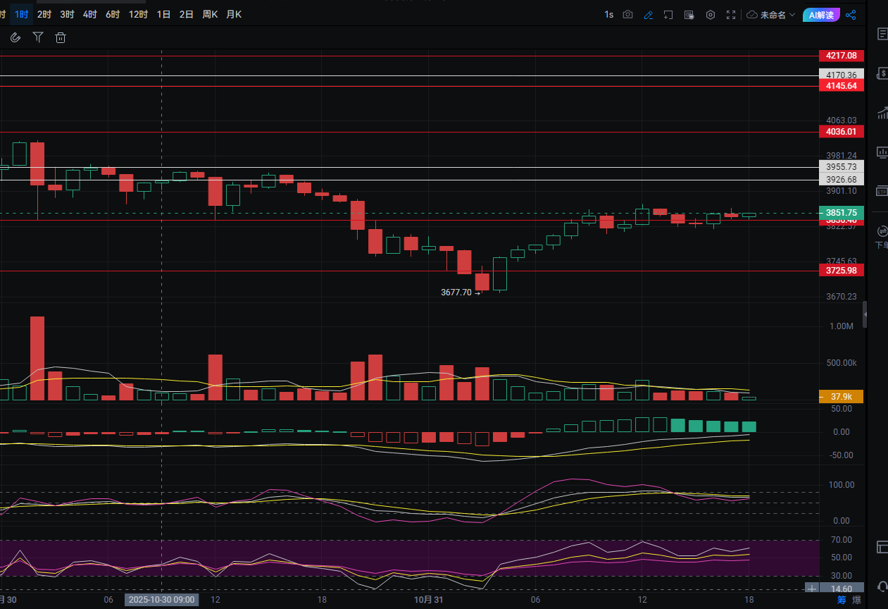 而以太走的比大饼恶心,3950一带的高位到3680一带,跌了近三百点,反弹就弹了近两百点,完全是接力式的清算空单散单。我们只能等下一段四小时连阴的走势出现,走一段预期的单边,在此前还是波段为主。需要重点关注的依旧是3850一带的老拐点,其他的3800,3750和3900这些分歧点也要关注。