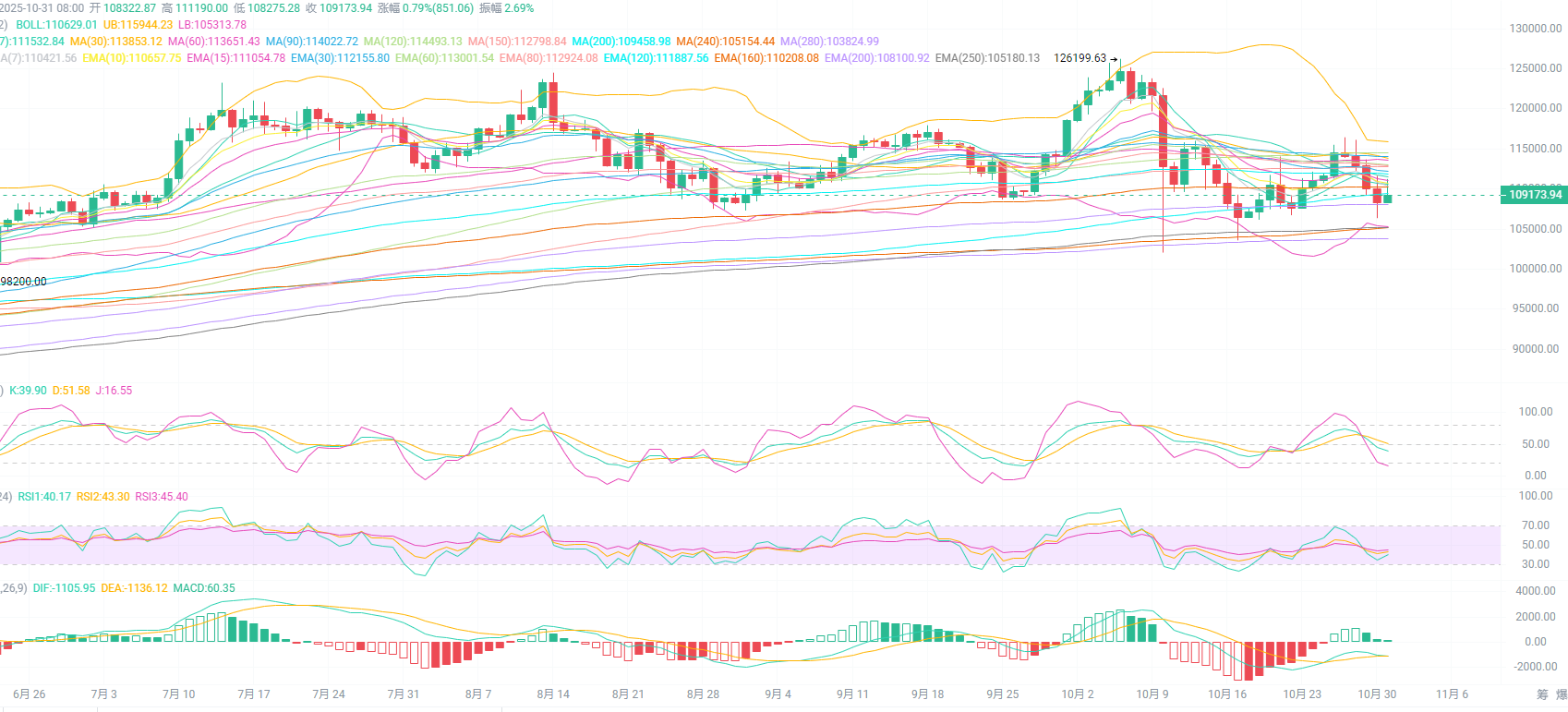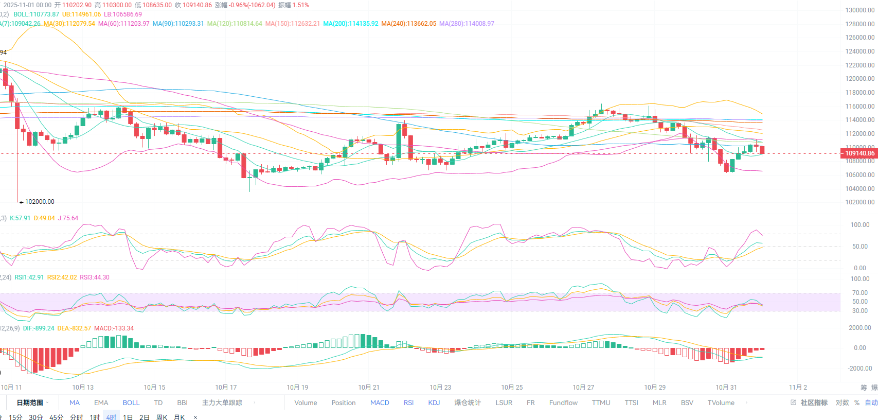 比特币现价109000附近。4H通道继续向下,日间下轨并没成功收上来,短期上方依旧面临MA60及中轨与MA120交叉压力,下方目标继续看下轨与昨日低点附近,MACD中红柱量能收缩无力,DIF与DEA收口失败存在二次背离现象,KDJ与RSI日间走到高位继续拐头向下,说明下方空间还是没有走完!