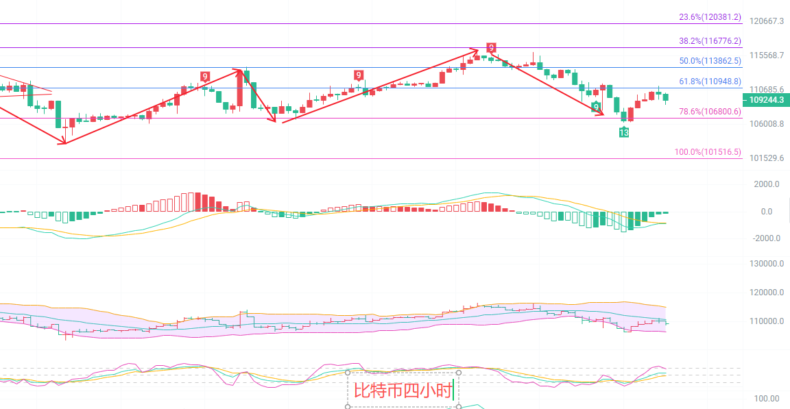 The four-hour K-line pulled back after hitting the 0.618 Fibonacci retracement resistance at 111,000, forming a bearish evening star pattern. The MACD shows a bottom divergence with decreasing volume. The short-term support to watch is 106,800. The Bollinger Bands are forming a downward channel, with the middle track at the channel resistance level of 110,700 and the lower track at 106,600. The strategy is to continue holding short until the market reaches below 106,800, after which you can consider whether to go long.