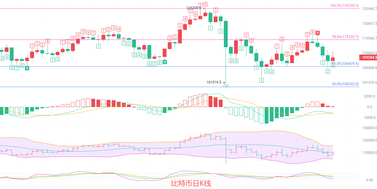 As of the time of writing, the daily K-line has a high of 111,233 and a low of 108,226. The daily line has hit the EMA15 trend resistance at 111,000 for two consecutive days. If the K-line falls below the opening price of 108,260, the MACD will end its expansion and begin to contract, with the DIF and DEA forming a death cross. Additionally, the daily line has failed to break through the middle of the Bollinger Bands at 110,600, resulting in a retreat without forming a solid breakout. The short-term trend is in a sideways phase, and it is expected that it will not quickly test the strength of the bottom support at 106,500; more time is needed.