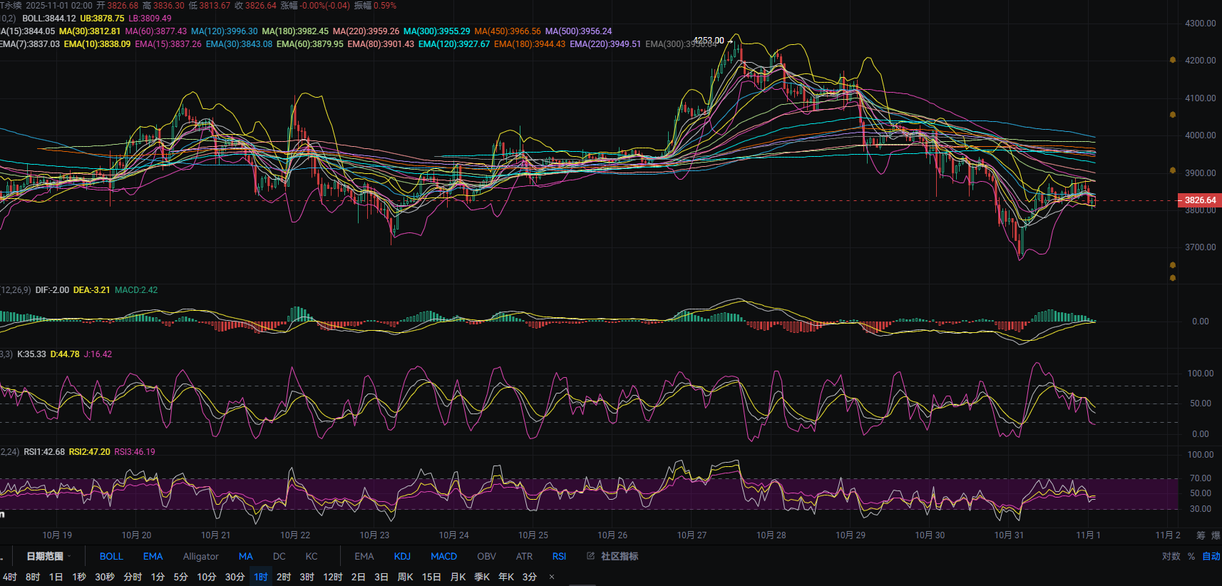 In the 4-hour chart, the upper Bollinger Band continues to press down, while the lower band remains parallel. The candlestick is blocked by the MA15 and the middle band range. Both KDJ and RSI show a downward turning pattern at high levels, and the MACD shows weak volume below the 0 axis, with the fast and slow lines exhibiting a top divergence. There is still space below, and entering a short position can defend the MA120 and the overlapping upper band position! The lower target can first look at the lower band near the 3700 position! If the weekend cannot hold yesterday's low, the market may further test the daily EMA220 (3540) position!