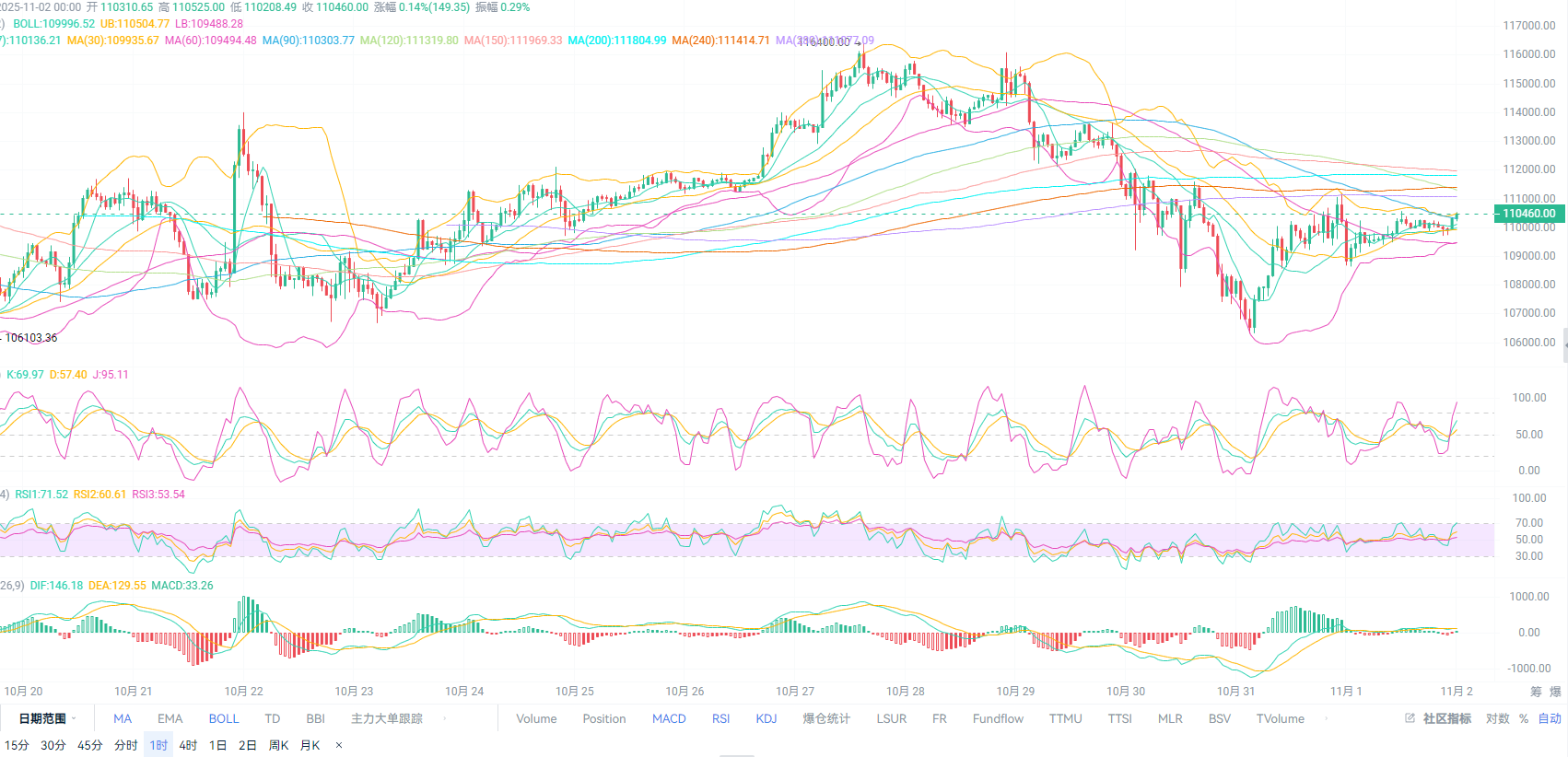 比特币现价110400附近。日间行情维持较长时间震荡后继续向上,目前行情位于1小时MA90与上轨位置,MACD中绿柱弱势放量,DIF与DEA死叉收口扳回金叉,KDJ与RSI向上发散即将接近超卖,说明上方空间还是没有走完!高点建议继续关注MA280与MA150区间,下方支撑关注下轨与MA60重合支撑处。