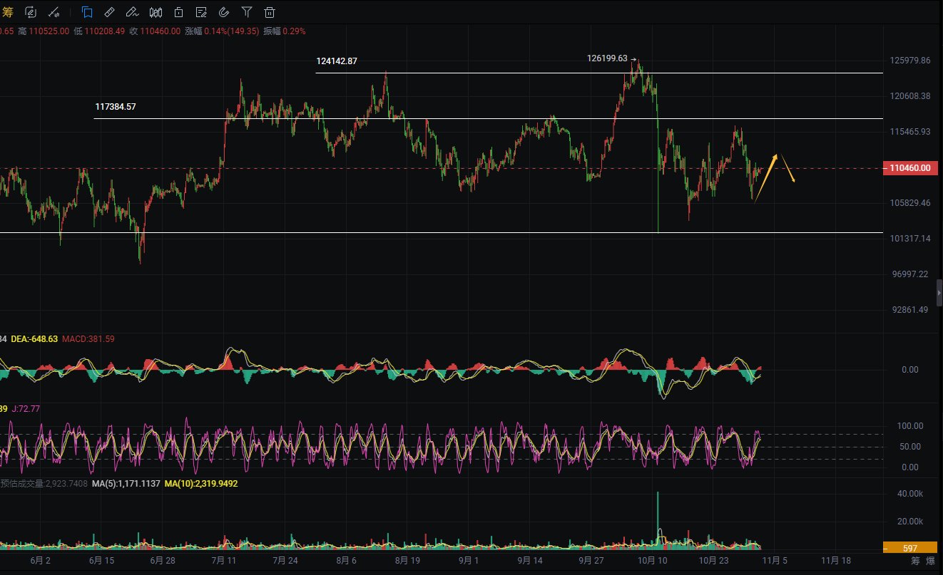 废话不多说,接下来我们老样子来看看技术面,日线级别币价在昨日形成较长阳线,表明暂时多头力量在逐渐崛起。小时线级别近期K线呈现震荡上行走势,低点逐步抬升,高点也不断创新高。技术指标小时线MACD红柱持续放量,但有缩短迹象,快慢线处于零轴上方,动能减弱但仍偏向多头。小时线RSI为57.6,未进入超买区间,市场情绪中性偏多。当前价格位于EMA7和EMA30之上,且EMA7>EMA30>EMA120,趋势明显偏多。短期操作上重点留意支撑位108500,和压力位112000,日内操作上可顺势做多为主,高位短空为辅。