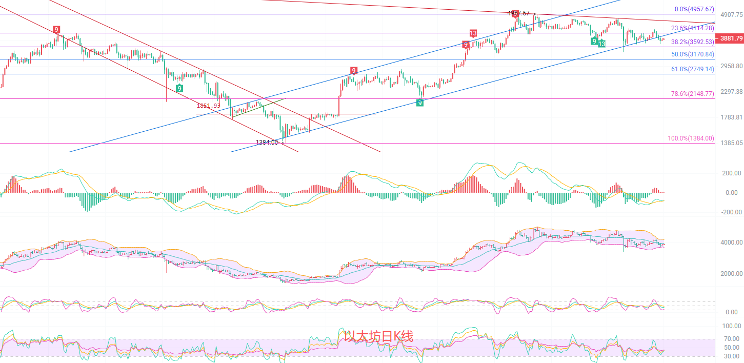 日K线发稿前最高3907,最低3828,现在是慢涨的行情,不排除3917会失守的情况,假设只收以后下一波南下点在EMA30趋势线附近4030,MACD底部背离趋势成型,就意味着行情有反转的动能存在,布林带中规阻力点在3950,整体趋势上看3950压力有效,所以南下暂时持有是没有问题的,