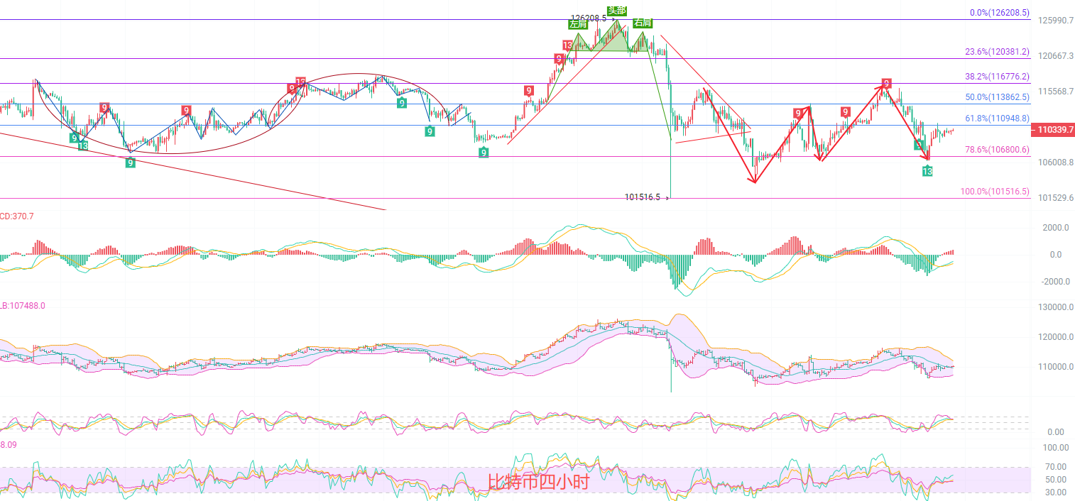 四小时K线横盘在趋势指标底部,EMA趋势指标收缩,阻力点在黄金分割线0.618一线111000,MACD底部背离放量上行但是K线横盘在11万,布林带上轨关注112000,中轨在109800,KDJ死叉空势受阻被扳回,盘口可以看到行情来到了关键的压力节点,只要压力不破南下依旧有效,压力破位北上口子就开了,一颗红心做好两手准备,做好安全防范
