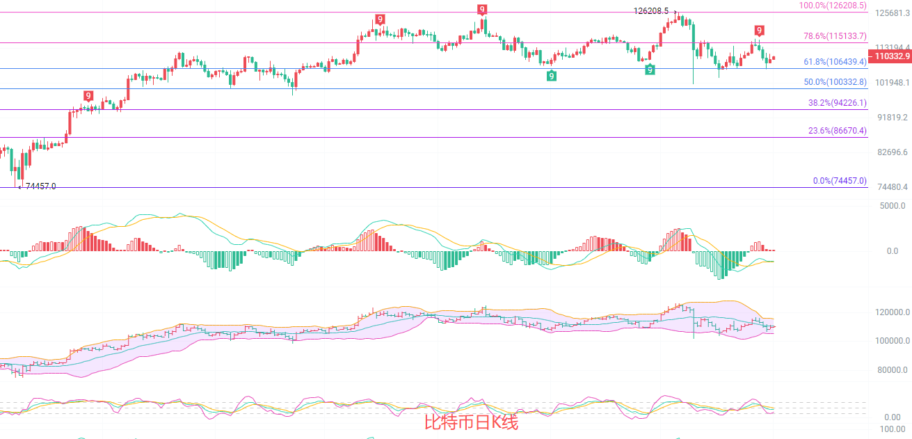 比特币现价110200,现在是北京时间凌晨一点半,连续多次探底黄金分割线0.618支撑都无法有效突破,开始出现回调趋势,有很大概率再次冲击111000压力位,EMA15趋势线已经来到了110966,南下暂时可以持有,只要主力不破111000,做好风控即可
