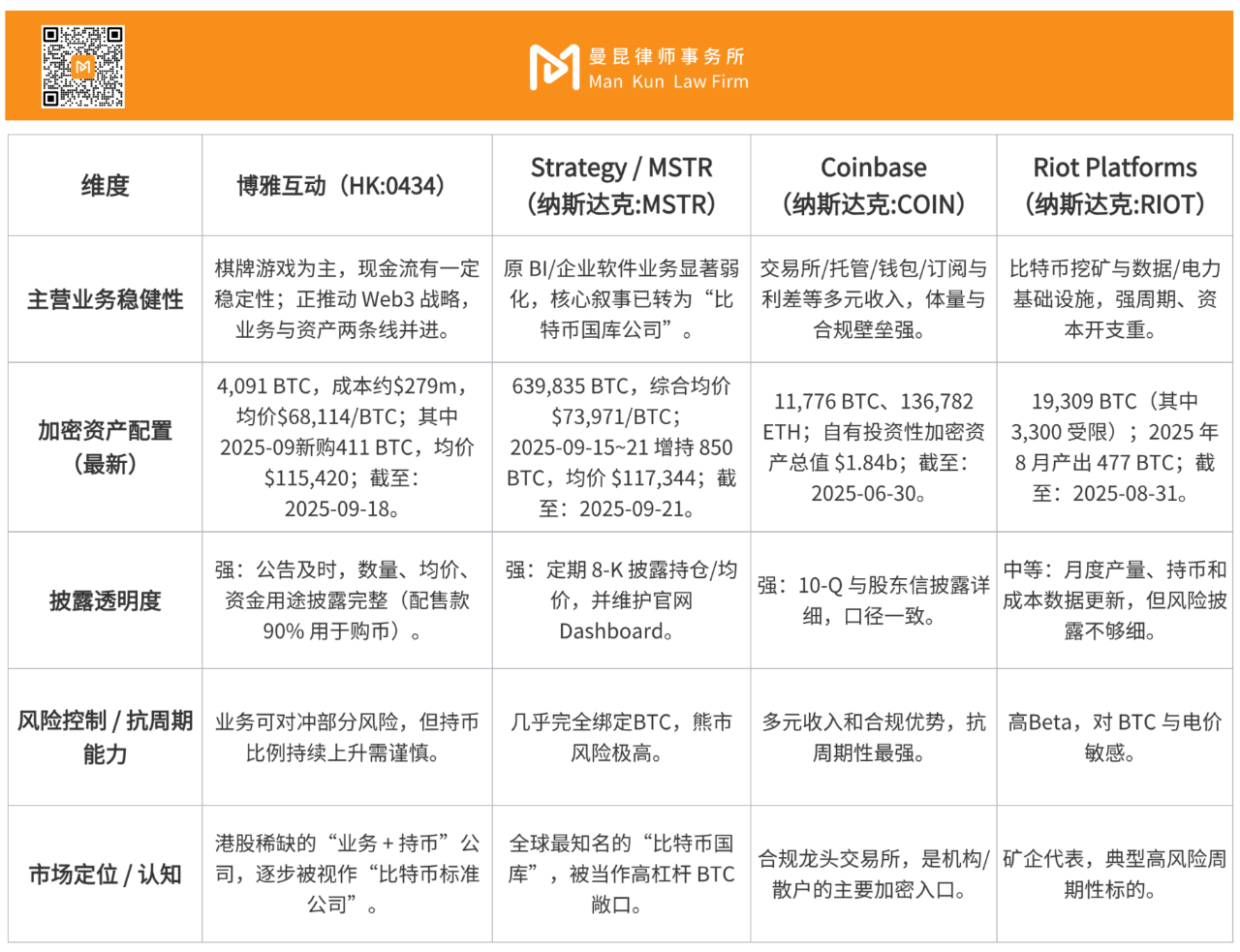 DAT公司并不是一个固定模板,而更像是一条光谱。在极端的一端,Strategy已经几乎彻底放弃了软件业务,选择把自己塑造成「企业级比特币国库」;在另一端,Coinbase的价值锚点仍然是交易、托管和合规生态,持币只是财务上的附注。介于二者之间,Riot提供了典型的高Beta矿企样本,盈利与风险同时被放大;而博雅互动则是港股少有的混合型案例,它一方面保持棋牌游戏的现金流,另一方面通过配售资金进入比特币,尝试构建「业务+储备」的双轨逻辑。