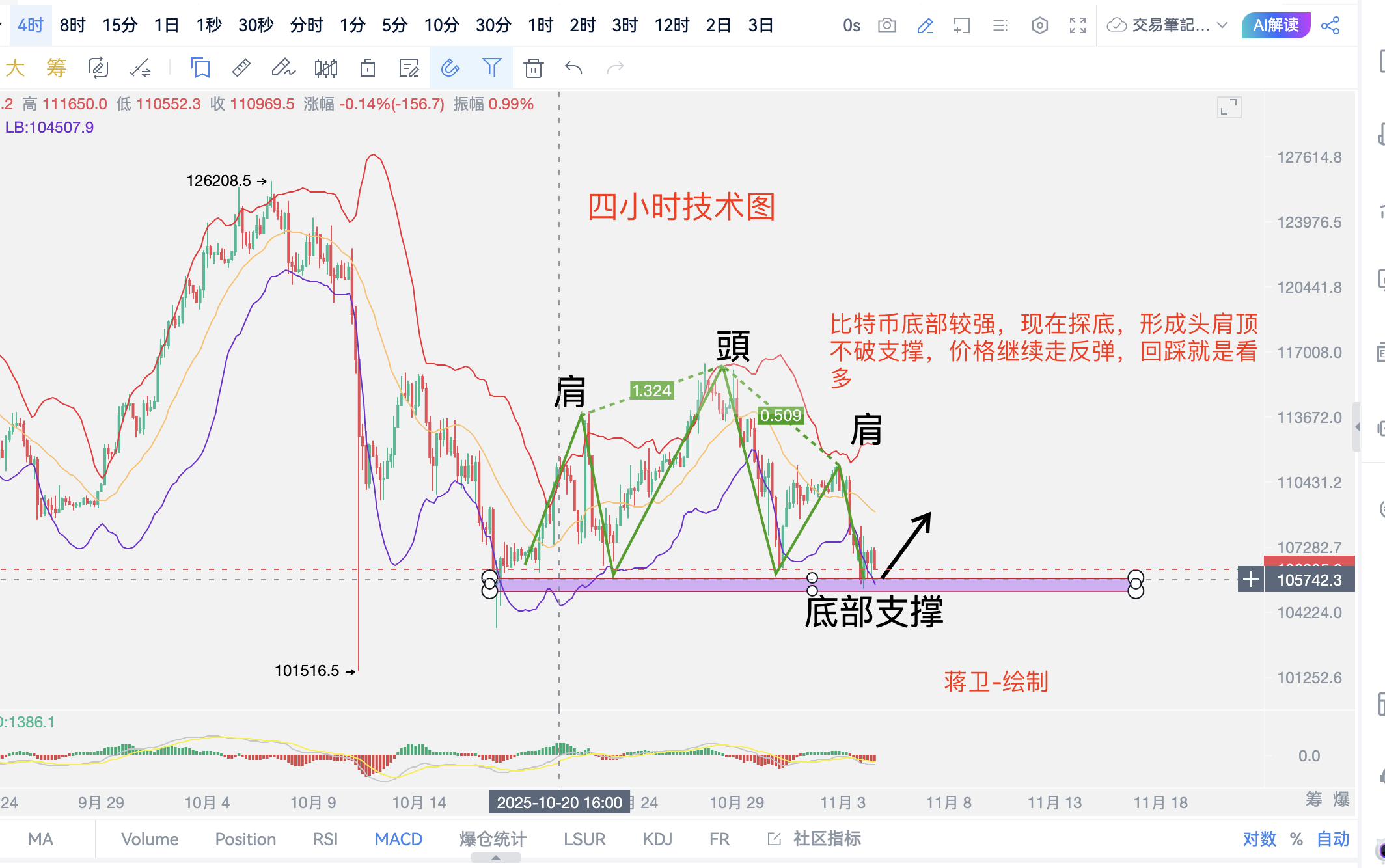 四小时价格走出头頭肩顶形态,k线还在底部支撑附近试探。并未突破延续下跌。昨日探底回升。让多头稍微缓解。那么今日价格如果能保证再106000上方企稳,多头还能有回头余力,反之就是多头的噩梦。那么再今日下方探底我觉得是先多为主。