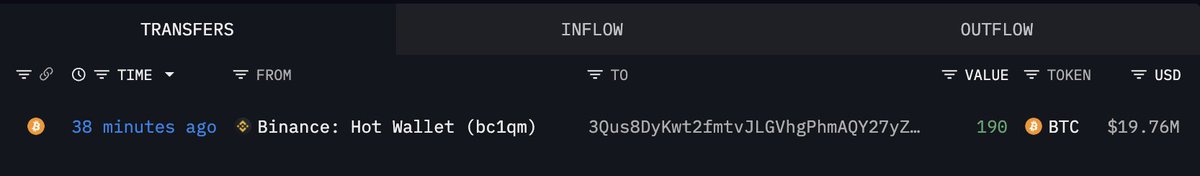 • 一个新钱包3Qus8D从#Binance提取了190 $BTC($1976万)。