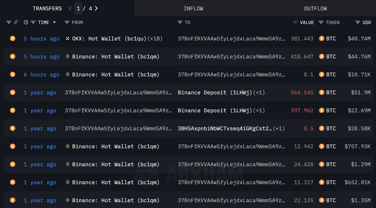 • 鲸鱼37BnFf,沉寂了一年,从#Binance和#OKX提取了800 $BTC($8550万)。