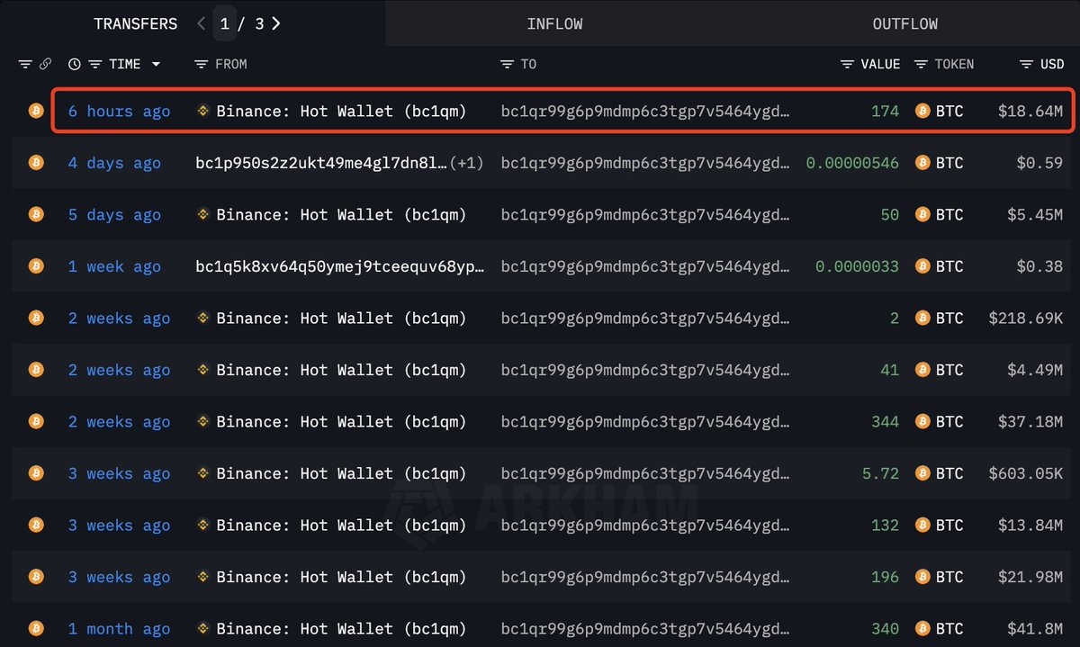 • 鲸鱼bc1qr9在6小时前又从#Binance提取了174 $BTC($1864万),现在持有3,036 $BTC($3.15亿)。