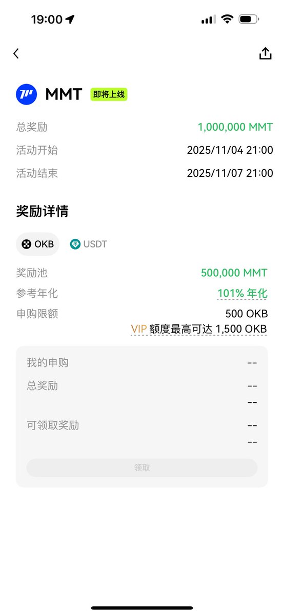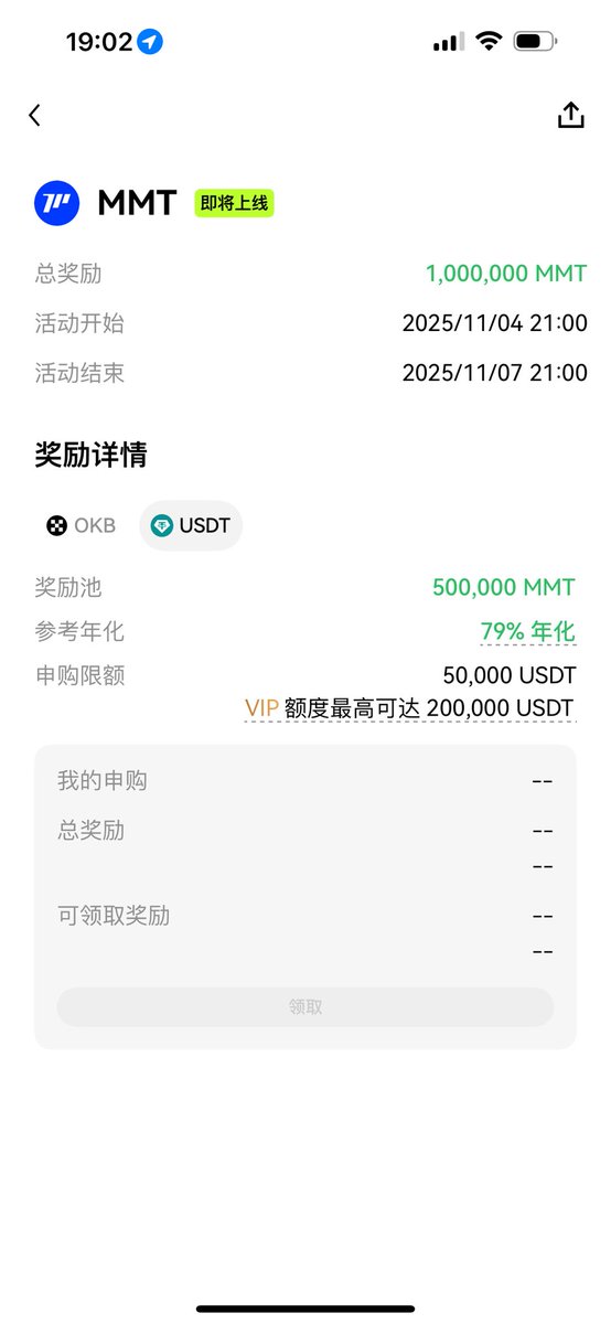 前边一直在说 #OKX 的收益太低了,这次看来 $MMT 给的筹码应该不少,这次 $OKB 的上限提升到了 1,500 枚, USDT 的上限提升到了 200,000 美元,我想OKX想传达的就是 VIP3 希望能让小伙伴冲一下,悲催的是我只是VIP1,没事,我也准备都打满了看看收益情况。