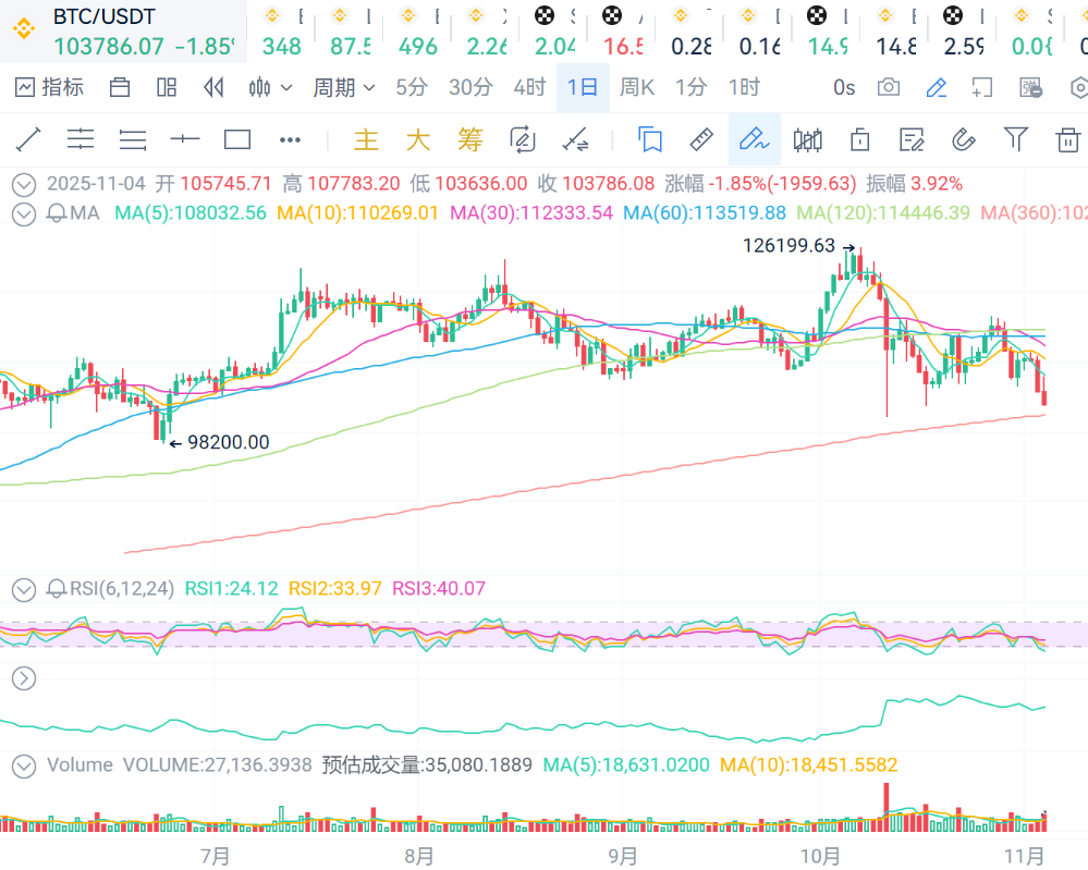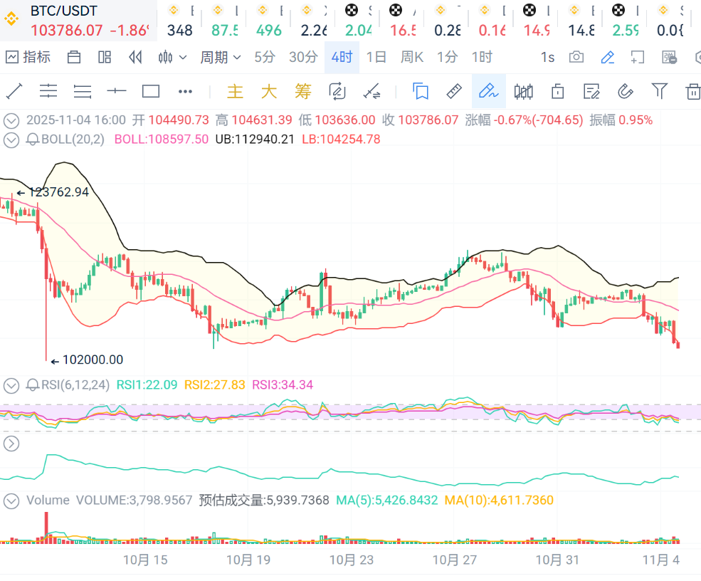 BTC:4小时级别看,价格跌破布林线下轨,价格走势弱势。