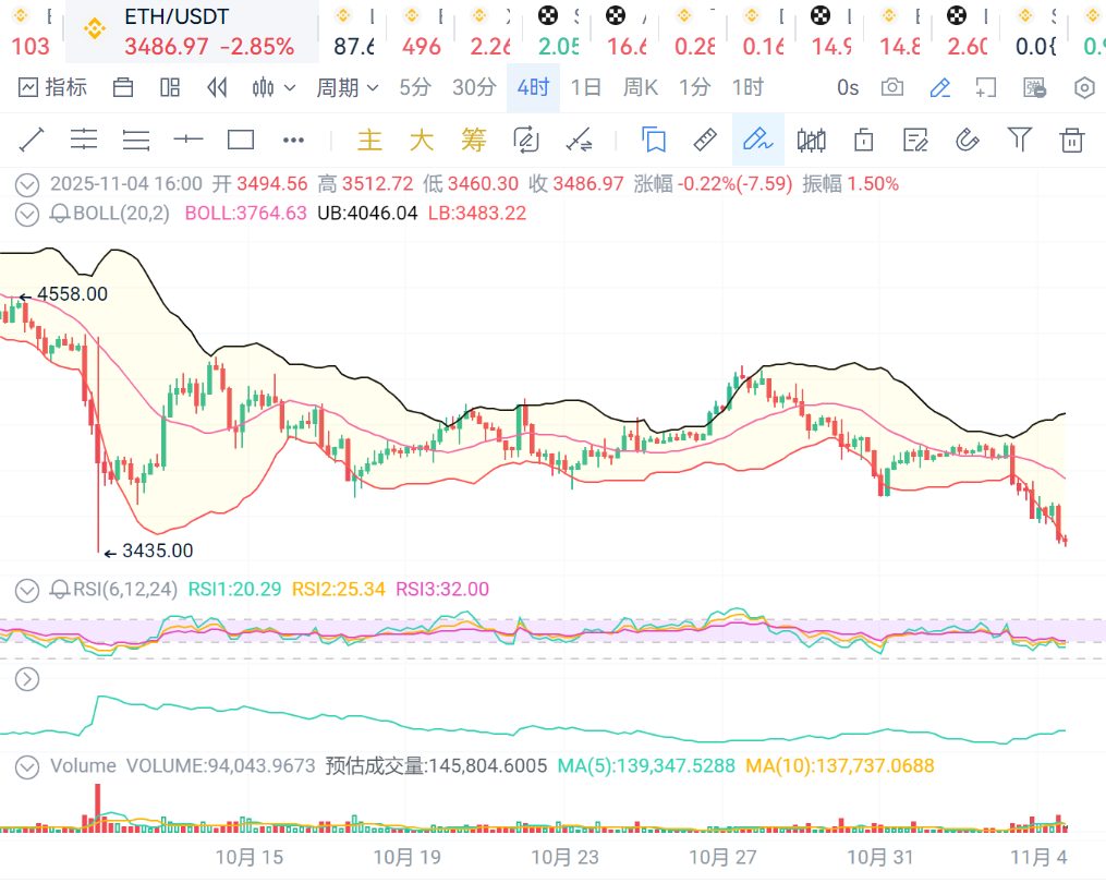 ETH:4小时级别看,价格跌破布林线下轨,价格走势弱势,支撑位3480,压力位3500.