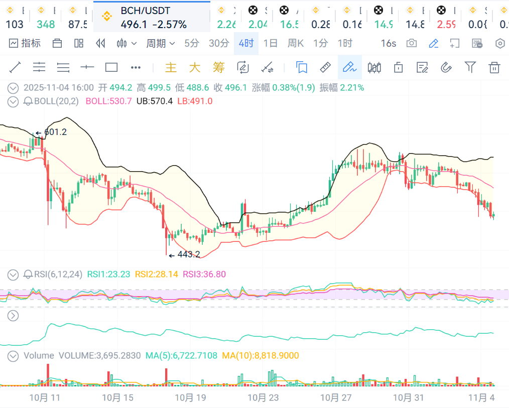 BCH:价格保持在布林线下轨附近,价格走势弱势,支撑位480,压力位510.