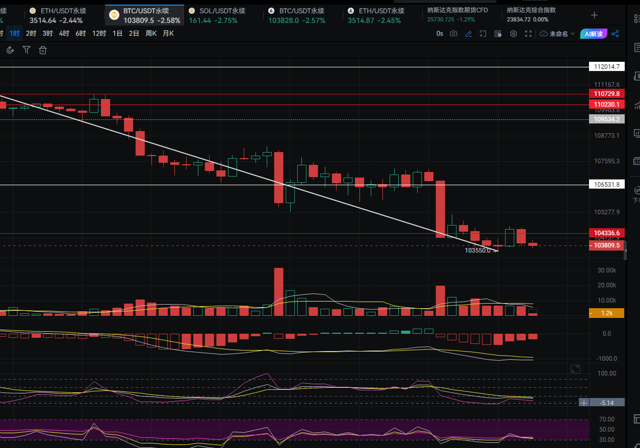 我们简单复盘一下 大饼11月3日夜盘反弹到108000后受到空头狙击,晚十一点砸到105200前支撑,而截止今天午间十二点的盘整都在围绕着这根阴柱的区间运行。头两根k反弹的急,后几道一小时阴阳交错,大小不一,纯对抗的走势。而kdj,rsi,macd几道线一致的在低位粘连,可见市场分歧很大,一直犹豫不决。直到午间三道指标一致死叉,大饼直接从106500跌到103800一带,你们看了昨天的思路,应该有印象,这不就是江新昨天给的位置?
