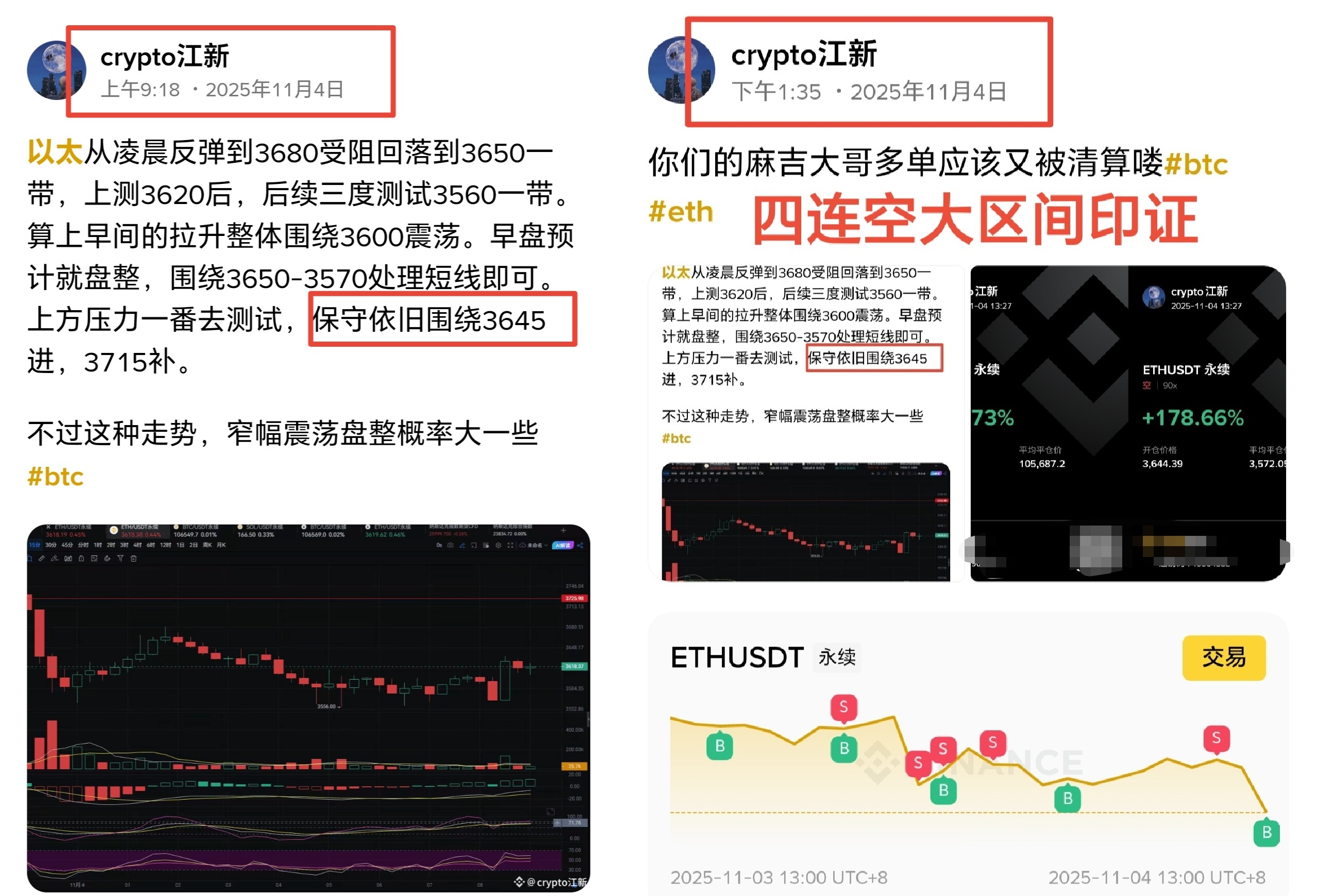 大家晚上好,我是老法师江新,这两天的结果多好,大多数人应该应该感受到了。 昨天晚盘提示让106800空和107500补,市场触及到的。而以太3650的拐点也是美的不行,而在夜盘,江某就身先士卒冲了一轮空。几段打点是滚仓等比例吃进了大区间。