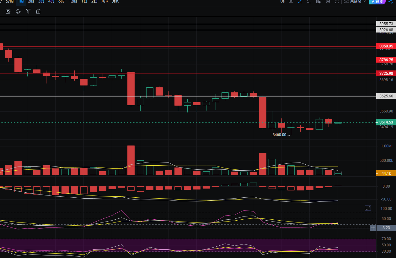 建议先做反弹再做空。先围绕着3420-3650大区间波段处理。如果你们对上周黑天鹅前有印象,就知道,极端行情前后,以太就是走的大区间拉锯 。日内3480多,3440补,3400损入空3580空,3625补,3660损