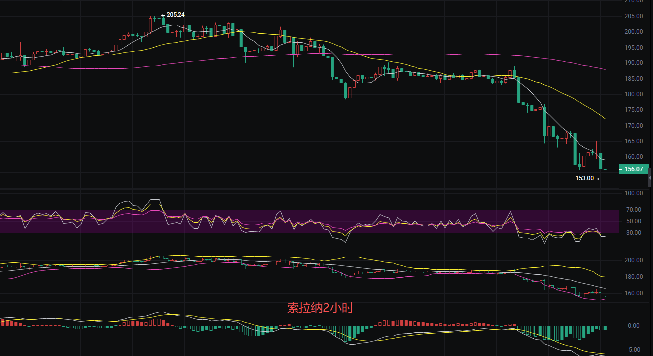 The daily chart shows a decline for two consecutive days, quickly falling from a high of 189 to 156. The 2-hour rebound strength is weak, and the MACD shows that bearish strength still dominates in the 2-hour timeframe. The EMA is unlikely to break through effectively in the short term, leading Liying to conclude that the market is entering a bearish phase, and it is advisable to refrain from entering the market for now and to observe.