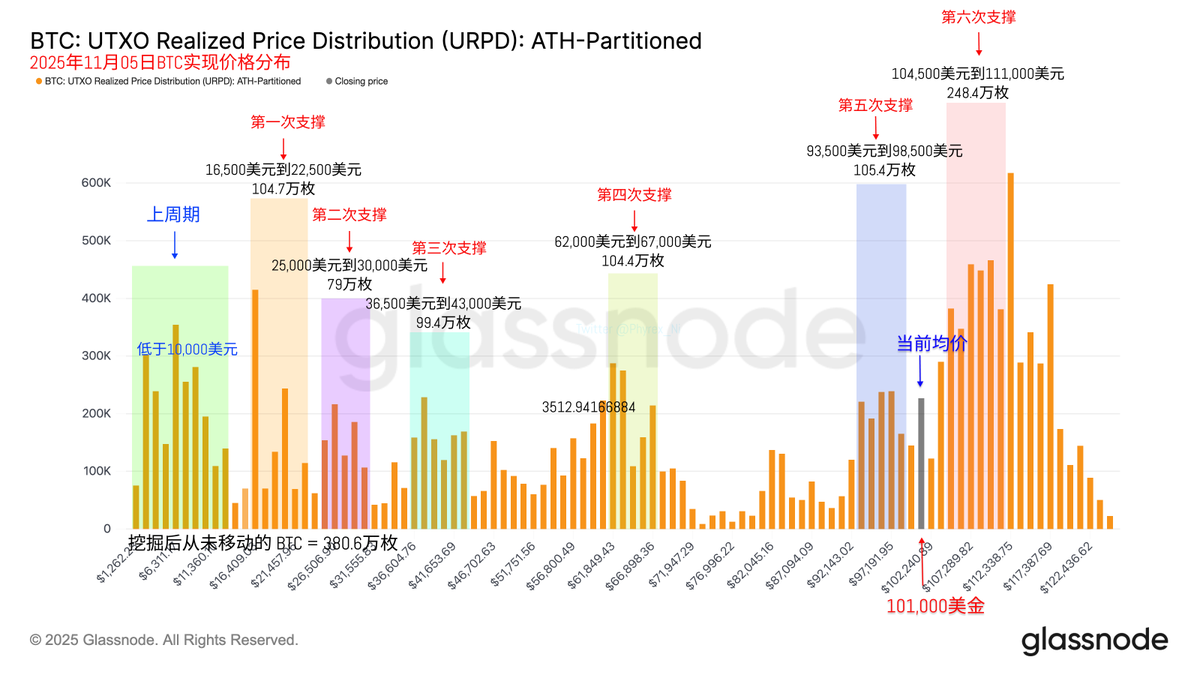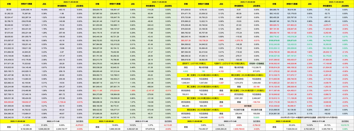 目前价格的下跌已经跌破了支撑区间,但104,500 美元到 111,000 美元的支撑位置并没有出现破坏,起码暂时这个位置的筹码结构还是完整的,并没有出现大幅的减持,一旦停摆结束,很可能会就会回归支撑区间。我的多单还没有平仓,但如果这个多单被爆,我就会在99,000美元的位置买现货。