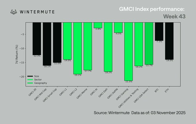 从指数层面看,广义上加密资产上周遭遇大幅抛售,GMCI-30指数下跌12%。各板块普遍收跌:
