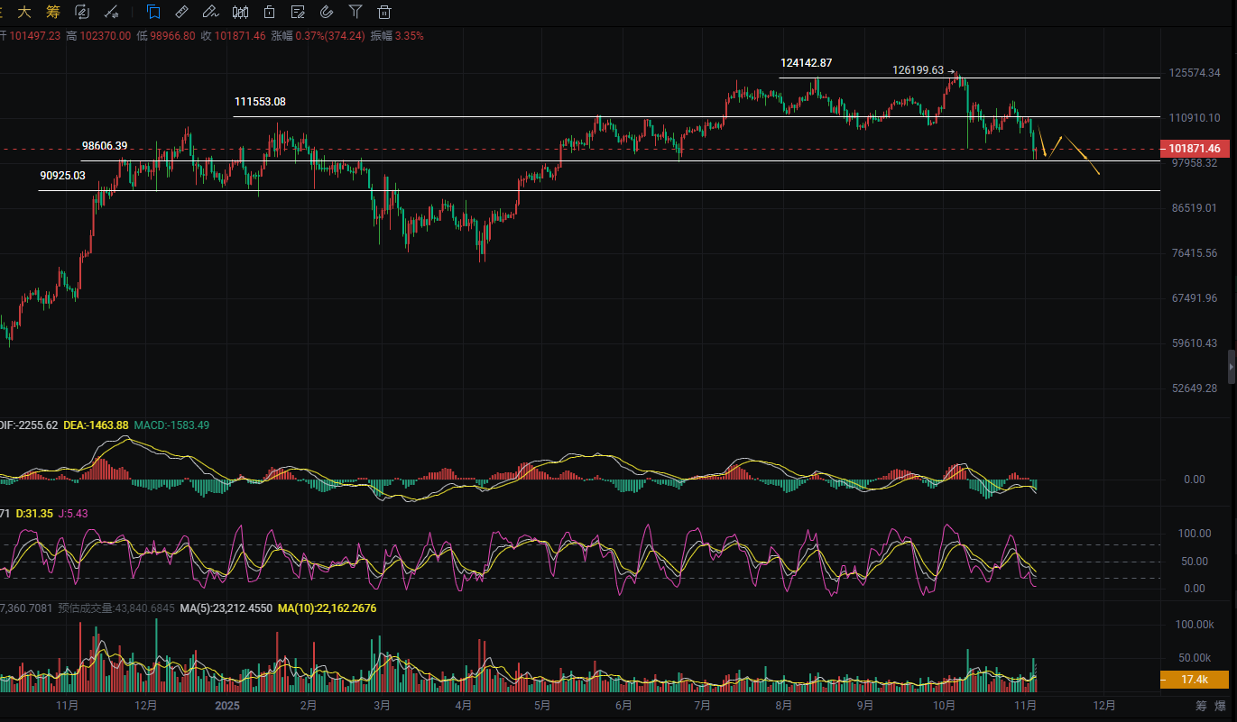 暴风雨过后的平静,接下来走势可以再好好看下技术面了,大饼日线级别近期形成连续阴线后出现小幅反弹,整体呈现弱势震荡格局。小时线级别在11月05日10:00到17:00期间,低点100700附近反弹至最高102300附近后一直横盘,未能突破前波段压力位,短期内仍处于区间震荡状态。技术指标MACD小时线中DIF和DEA均为负值,且MACD柱状图持续缩量,表明空头力量减弱但尚未转强,多头动能不足。RSI小时线数值43.2,处于中性偏弱区域,未进入超买或超卖区,市场情绪较为平稳。EMA小时线7周期EMA与30周期EMA交叉向下,120周期EMA远离当前价格,近期趋势依旧偏空。