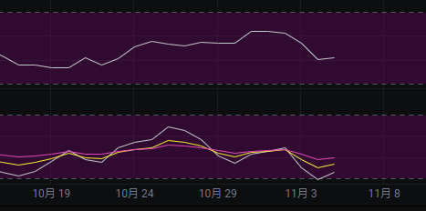 Mfi和rsi上看,两个指标总体上是向下,rsi已经触及到了超卖区域,但mfi还在中性偏下的区域,后续如果继续看跌,则mfi最好是能打到超卖区域再看。