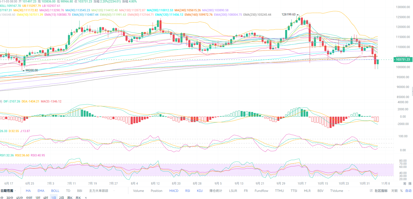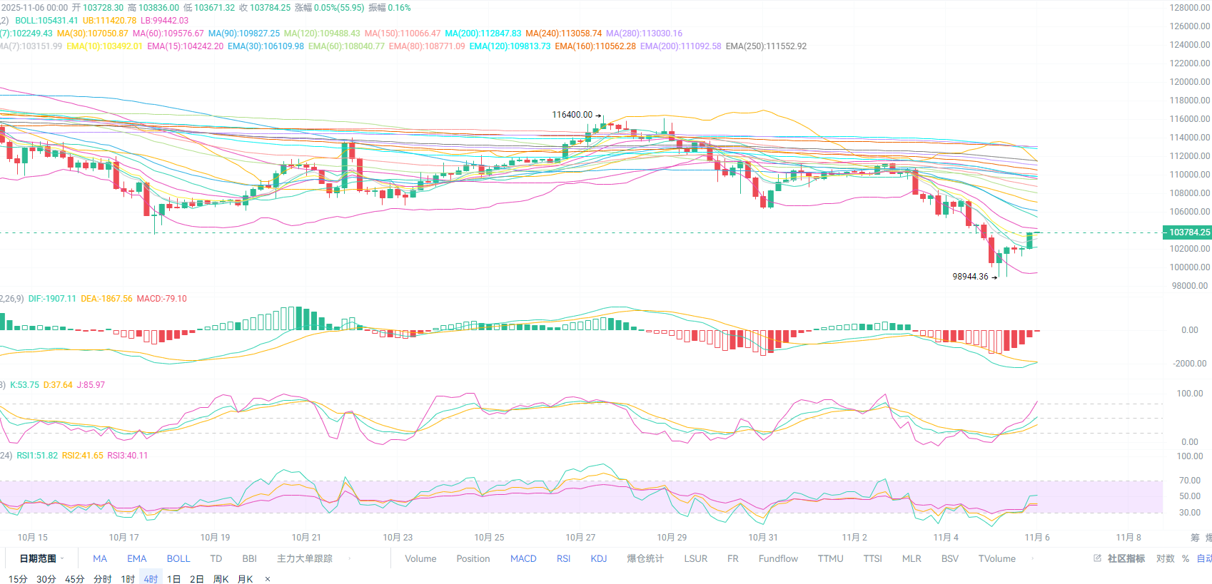 比特币现价103700附近。继昨凌晨比特币空单在101000止盈后,昨日红姐文稿中说到行情在挑战10万关口后会达到2日图中MA200(99000)附近,多单再次精准抄底试仓成功!目前行情正在继续回暖,1日图中依旧形成双针探底形态继续向上接近MA280位置,KDJ与RSI也是实现超卖拐头向上,短期需要关注第一压力位MA280,第二压力位看EMA250(105200)。