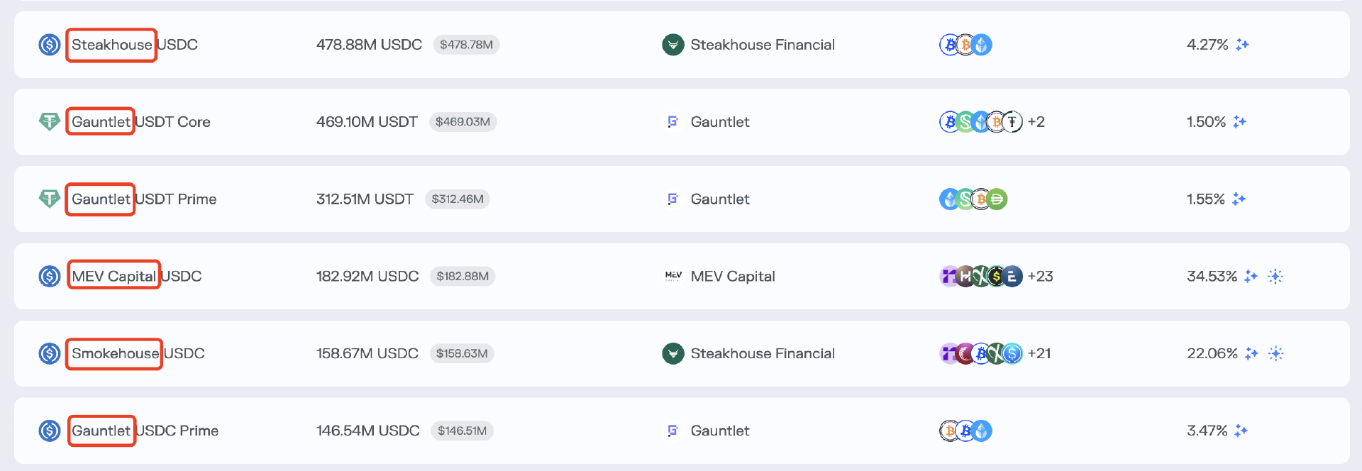 Odaily 注:上图为 Morpho 上的 Curator 资金池,红框部分的Steakhouse、Gauntlet 等即Curator 主体的名称,代表由该主体负责设计、部署、管理该资金池。