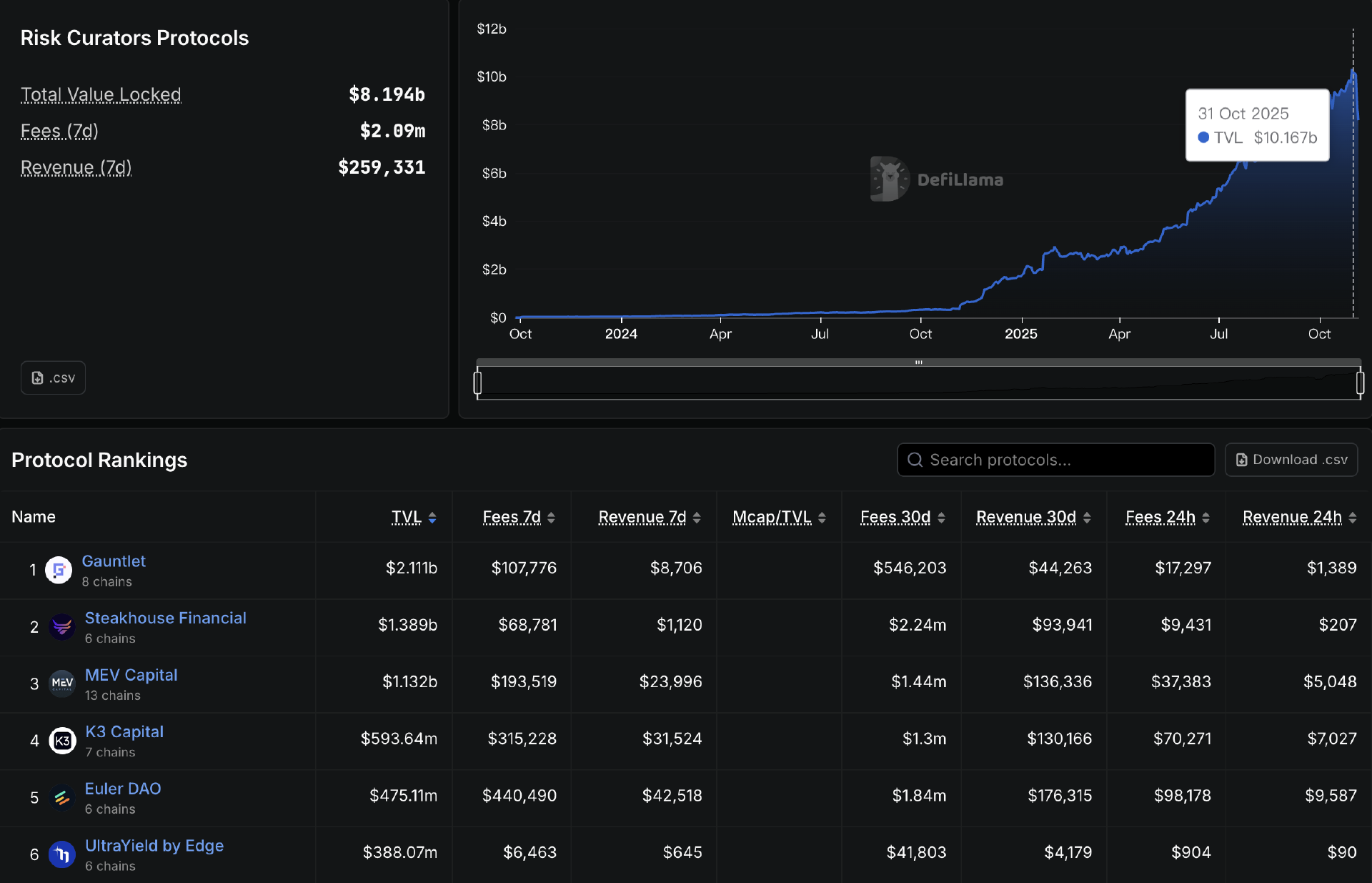 由于 Curator 所负责的资金池往往能够提供比经典借贷市场(如 Aave)更可观的收益,该模式自然而然地可吸引资金的青睐。Defillama 数据显示,由Curator 负责的资金池总规模在过去一年间飞速增长,10 月 31 日曾一度突破 100 亿美元,截至发文仍暂报 81.9 亿美元。