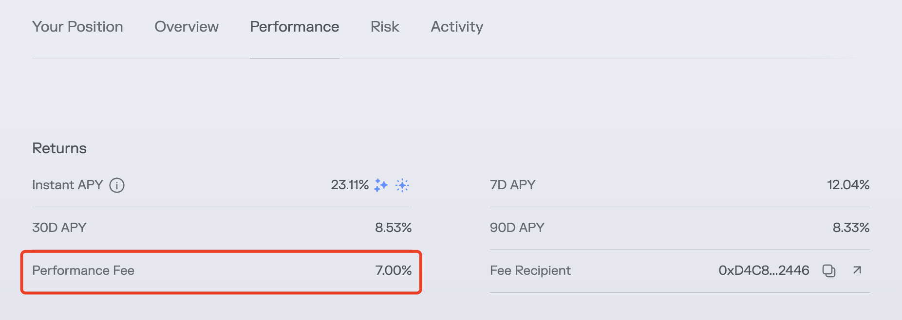 在现实情况下,业绩分成是最常见的 Curator 收入来源。如下图所示,Morpho 在以太坊主网上由 MEVCapital 负责的 USDC 资金池会收取 7% 的绩效分成。