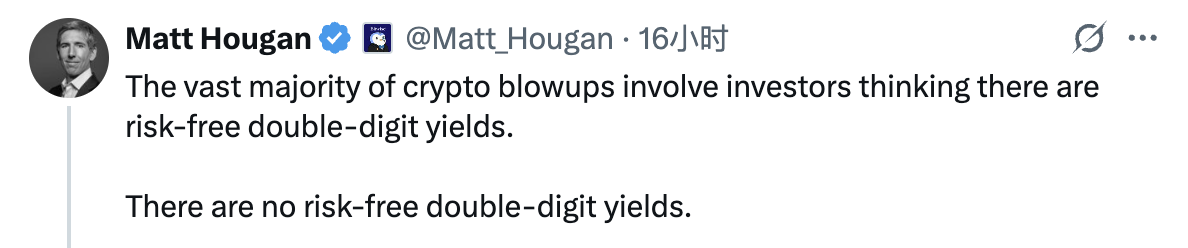 最重要的是,用户需要意识到风险总是与收益率正相关,在投出资金配置决策之前,要对最极端的情况最好思想预防 —— 可以时刻牢记 Bitwise 首席投资官Matt Hougan 的这句话:「绝大多数加密货币的崩盘都是因为投资者误信了两位数的无风险收益率,而市场上根本不存在没有风险的两位数收益率。」