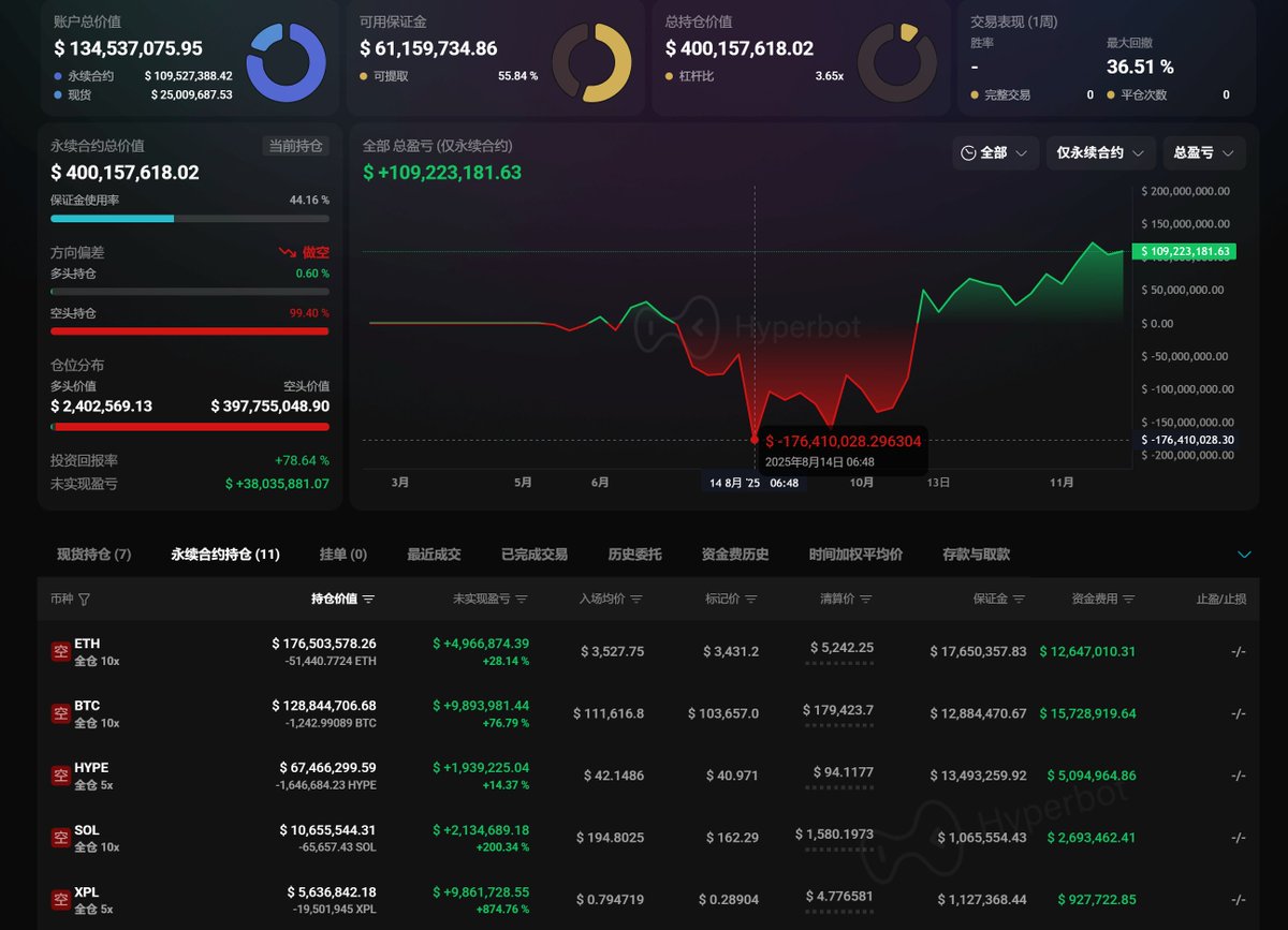 hype最大持仓空单交易者浮盈近4000万美元无限保证金真好哇想必大家都看了hype的四大A9交易员了吧?结果殊途同归但没多少人报道这位hype持仓最大的交易员从5月中旬开启BTC/ETH/SOL巨额空单后在8月中旬空单最高浮亏1亿7千万美元