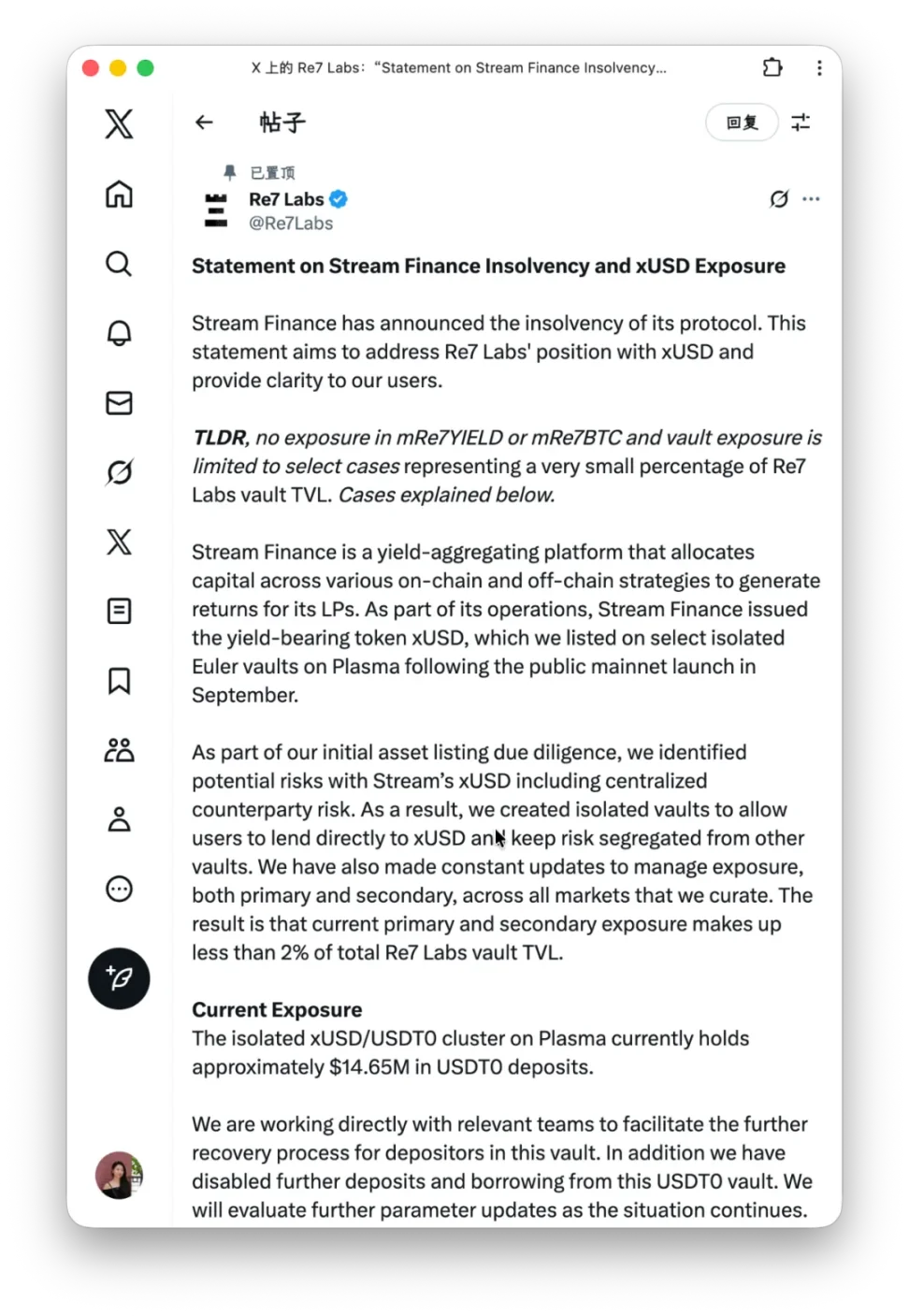 除此之外,Euler、Morpho 上的多个 Curator(我翻译为主理人)接纳 xUSD 资产,用户资产在各个 Vault 随机殉爆,缺乏 SVB 中的美联储紧急应对角色,接下来就是可能的流动性危机。