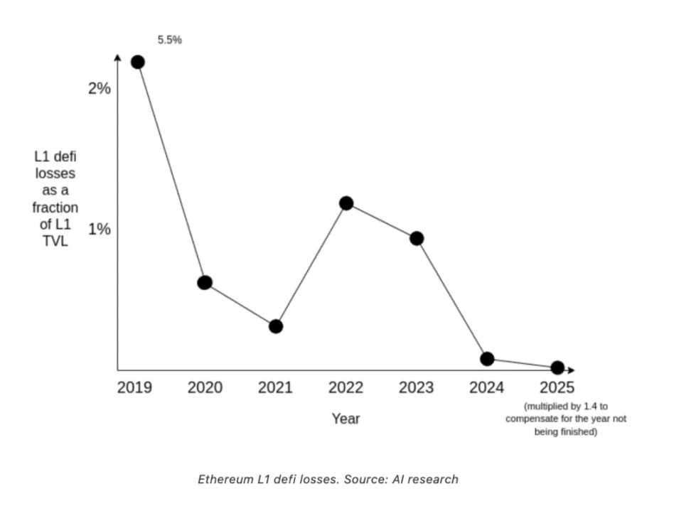 不论是 Vitalik 给出的数据,还是更专业研究机构的数据,DeFi 的安全程度确实在上升,和 1011 币安的爆仓数据以及 Bybit 的巨额被盗相比,DeFi 尤其是 YBS 的暴雷和损失不值一提。