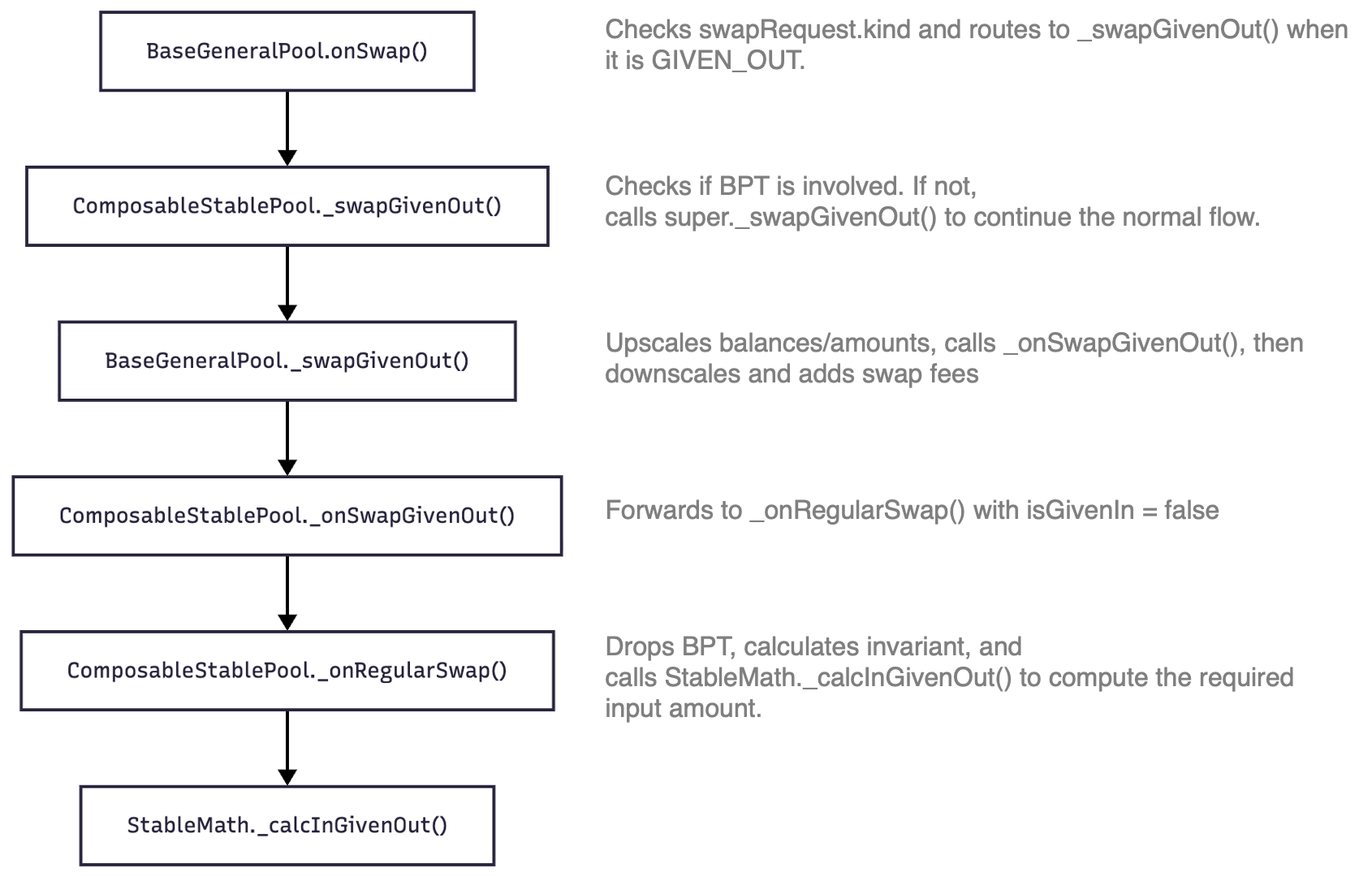 通常,一次 batchSwap() 操作由多个代币之间的交换组成,这些交换通过 onSwap() 函数执行。以下描述了当 SwapRequest 被指定为 GIVEN_OUT 类型时的执行路径(注意:ComposableStablePool 继承自 BaseGeneralPool):