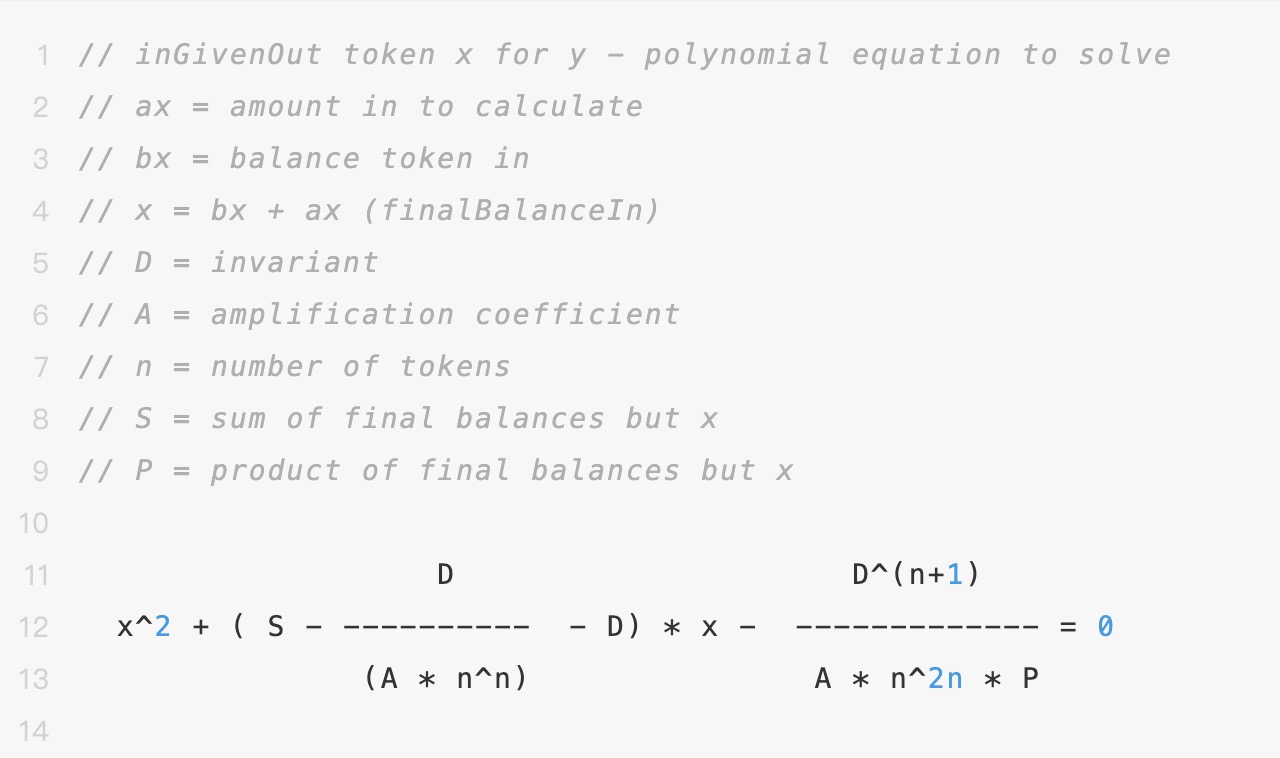 以下展示了 GIVEN_OUT 类型交换中 amount_in 的计算过程,该计算涉及不变量 D。