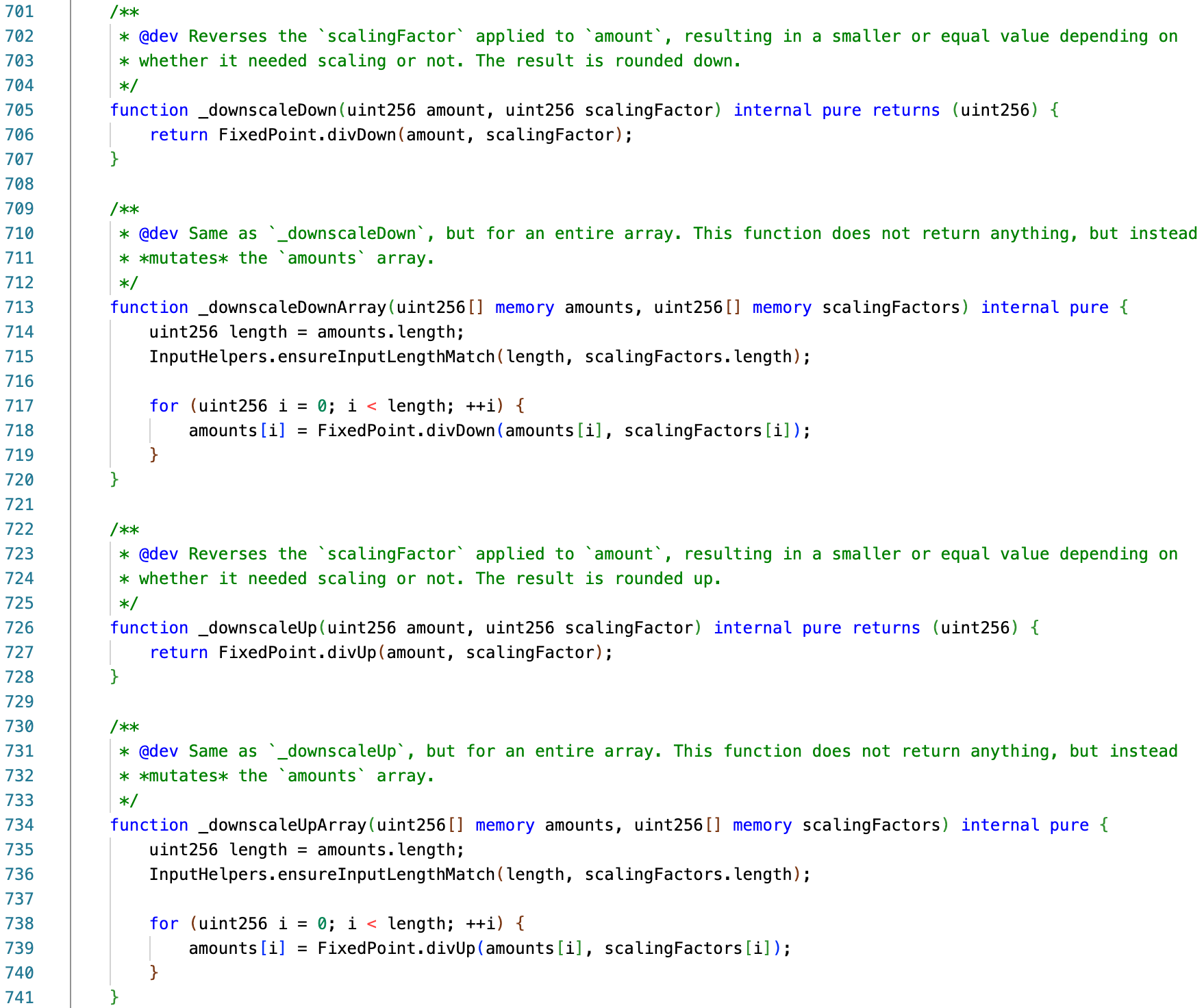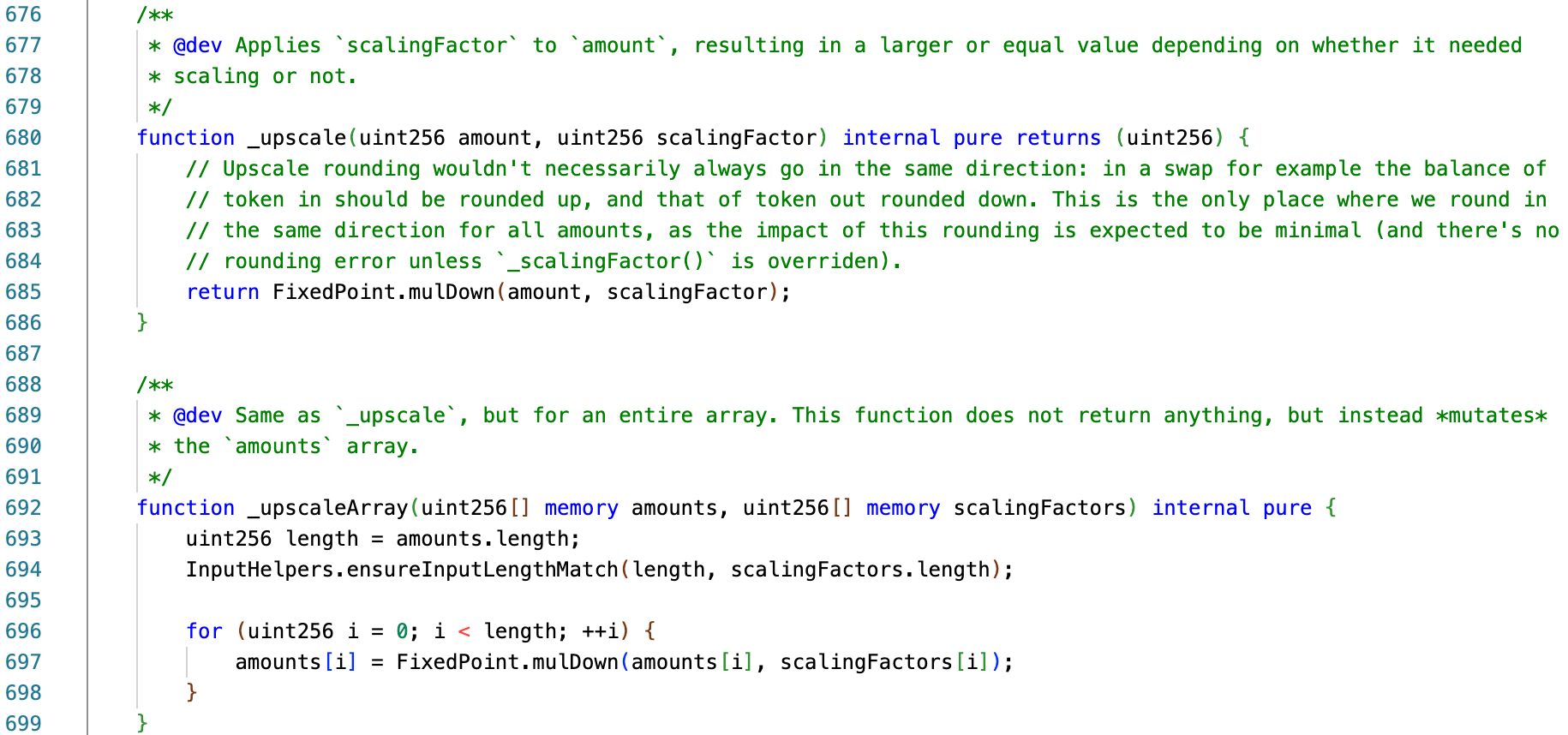 为了统一不同代币余额之间的计算精度,Balancer 执行了以下两步操作: