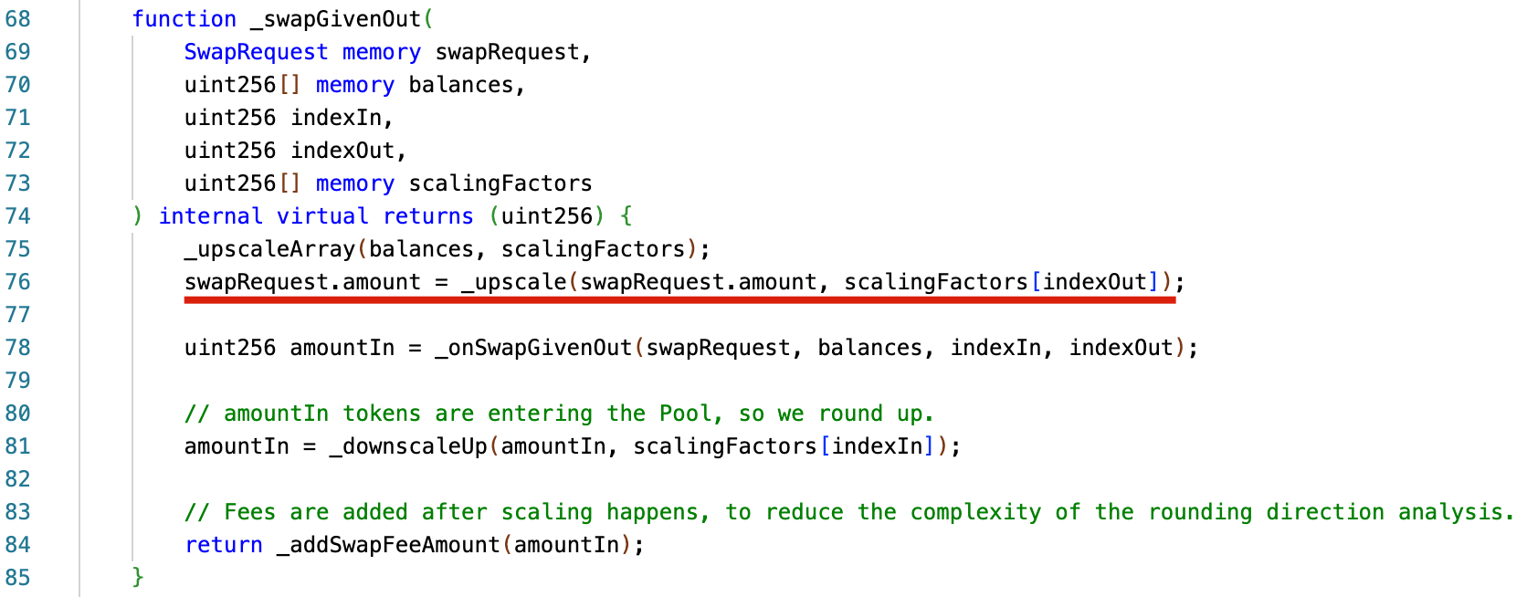 根本问题源于 BaseGeneralPool._swapGivenOut() 函数中在upscaling过程中执行的向下取整(rounding-down)操作。具体来说,_swapGivenOut() 通过调用 _upscale() 函数对 swapRequest.amount 进行了错误的向下取整。随后,该被取整的数值被作为 amountOut,在调用 _onSwapGivenOut() 计算 amountIn 时被使用。这种行为事实上违反了通用的安全实践,即舍入方向应始终使协议受益。