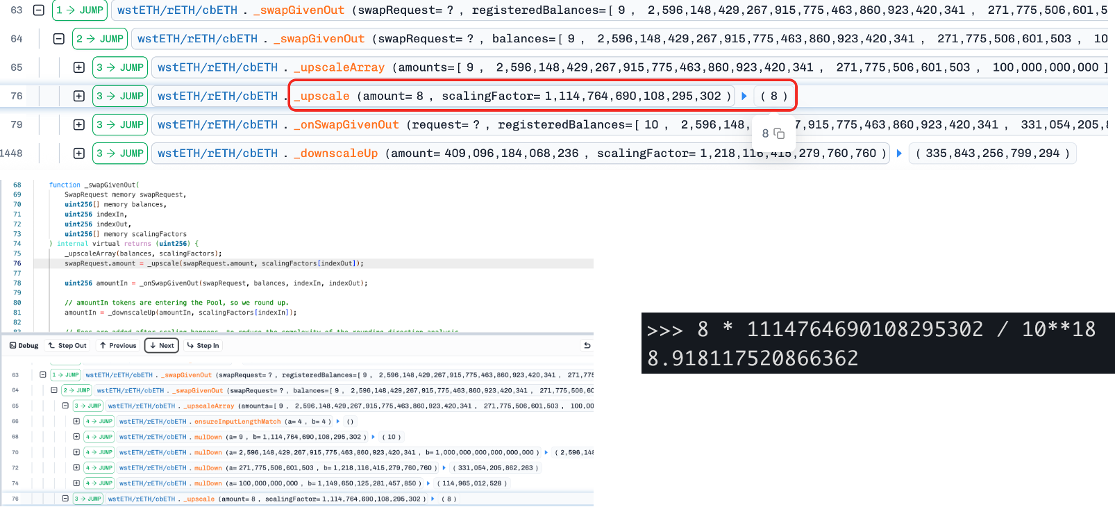 步骤 2: 攻击者随后使用精心构造的量(= 8)在另一个底层资产(wstETH)与 cbETH 之间进行交换。由于在缩放代币数量时发生向下舍入,计算得到的 Δx 略微变小(例如从 8.918 变为 8),从而导致 Δy 被低估,进而使不变量 D(基于 Curve 的 StableSwap 模型)变小。由于 BPT price = D / totalSupply,BPT 价格因此被人为压低。