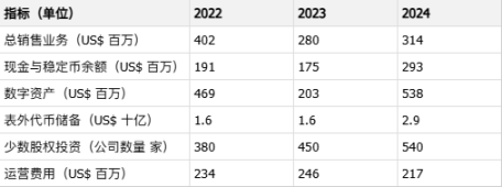 根据 Animoca Brands 披露的近三年主要数据(如下表), 2022–2024 期间总体收入略有回落, 但数字资产与股权投资规模持续增长, 运营支出保持稳定, 显示出业务从投机周期向稳态资产配置过渡的迹象。