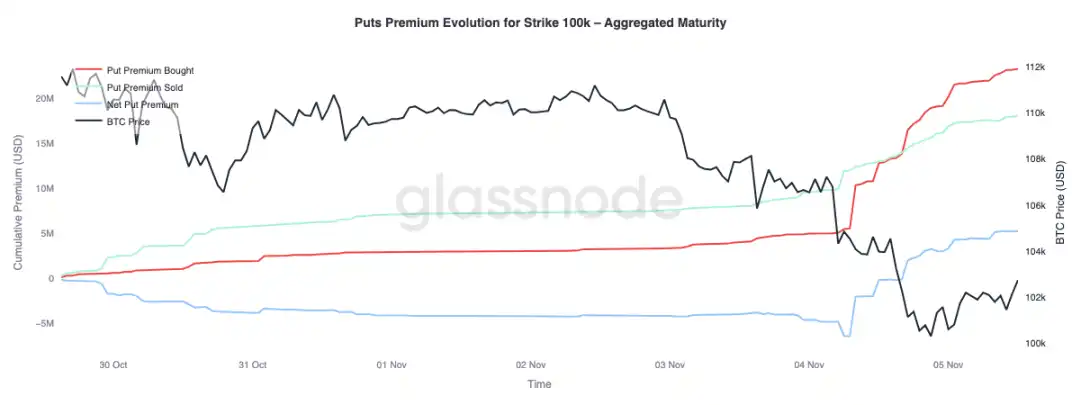 观察 10 万美元行权价的看跌期权溢价,可进一步洞察当前情绪。过去两周,看跌期权净溢价逐步上升,昨日随着牛市可能终结的担忧加剧,溢价大幅飙升。抛售期间看跌期权溢价冲高,即便比特币在支撑位附近企稳,溢价仍维持高位。这一趋势确认对冲活动持续,交易者仍选择保护而非重新承担风险。