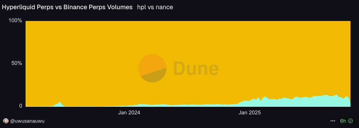 挑战巨头Binance:2024年9月底,Hyperliquid的交易量占据了Binance周交易量的约14%。